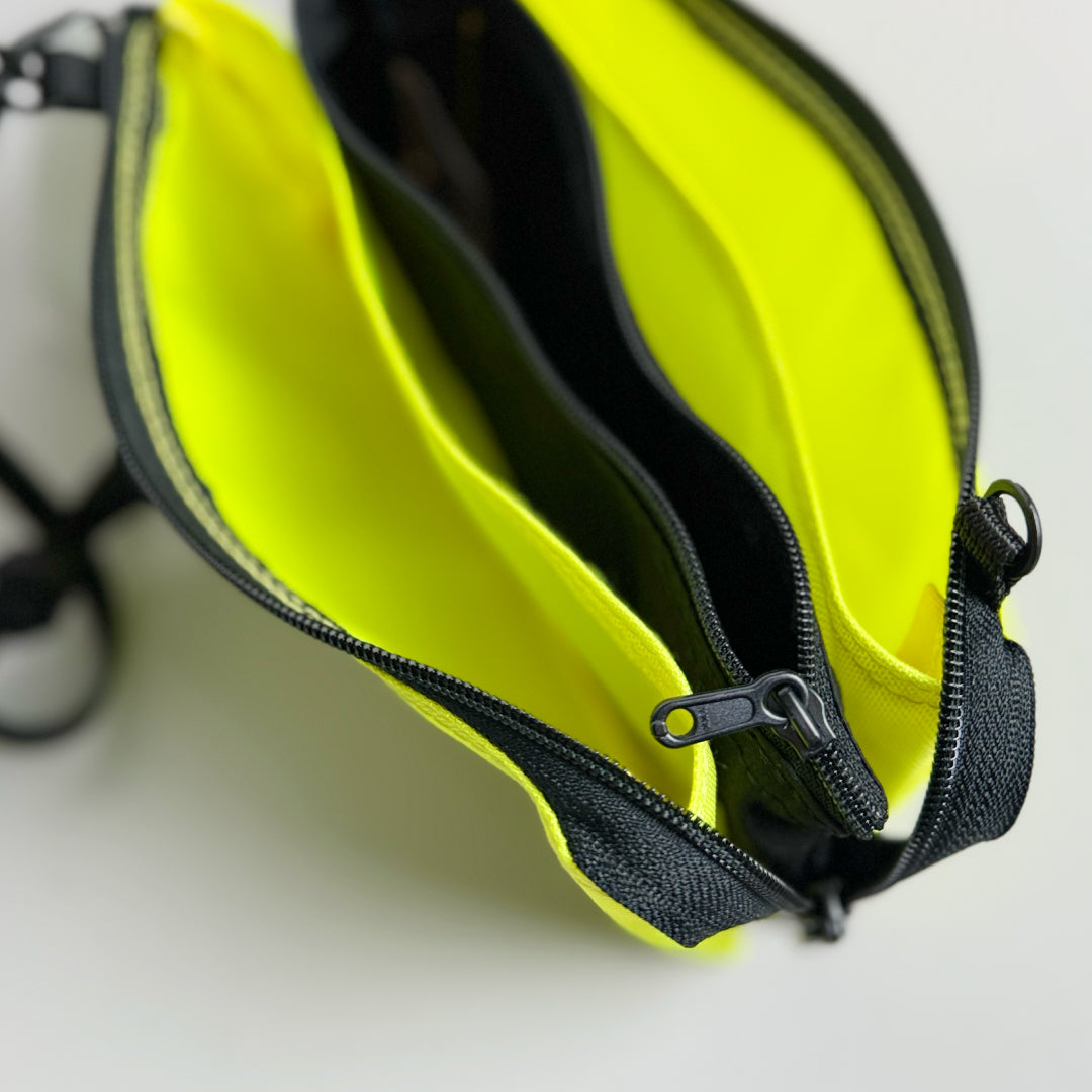 - ► ポーチを3つ繋げた遊び心溢れる設計で、財布や小物入れとしてマルチに活躍します。ストラップを外してカラビナでカスタムするなど、シーンに合わせたアレンジも自在です。