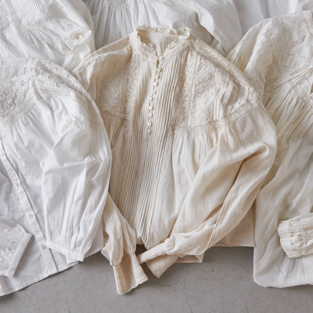 - ► 3種のリバーレースや刺繍、ピンタックを贅沢に凝縮した、アンティーク感漂う至極の一枚。しっとりとした落ち感のあるレーヨン混素材が、大人の女性にふさわしい上品でクラフト感のある佇まいを演出します。
