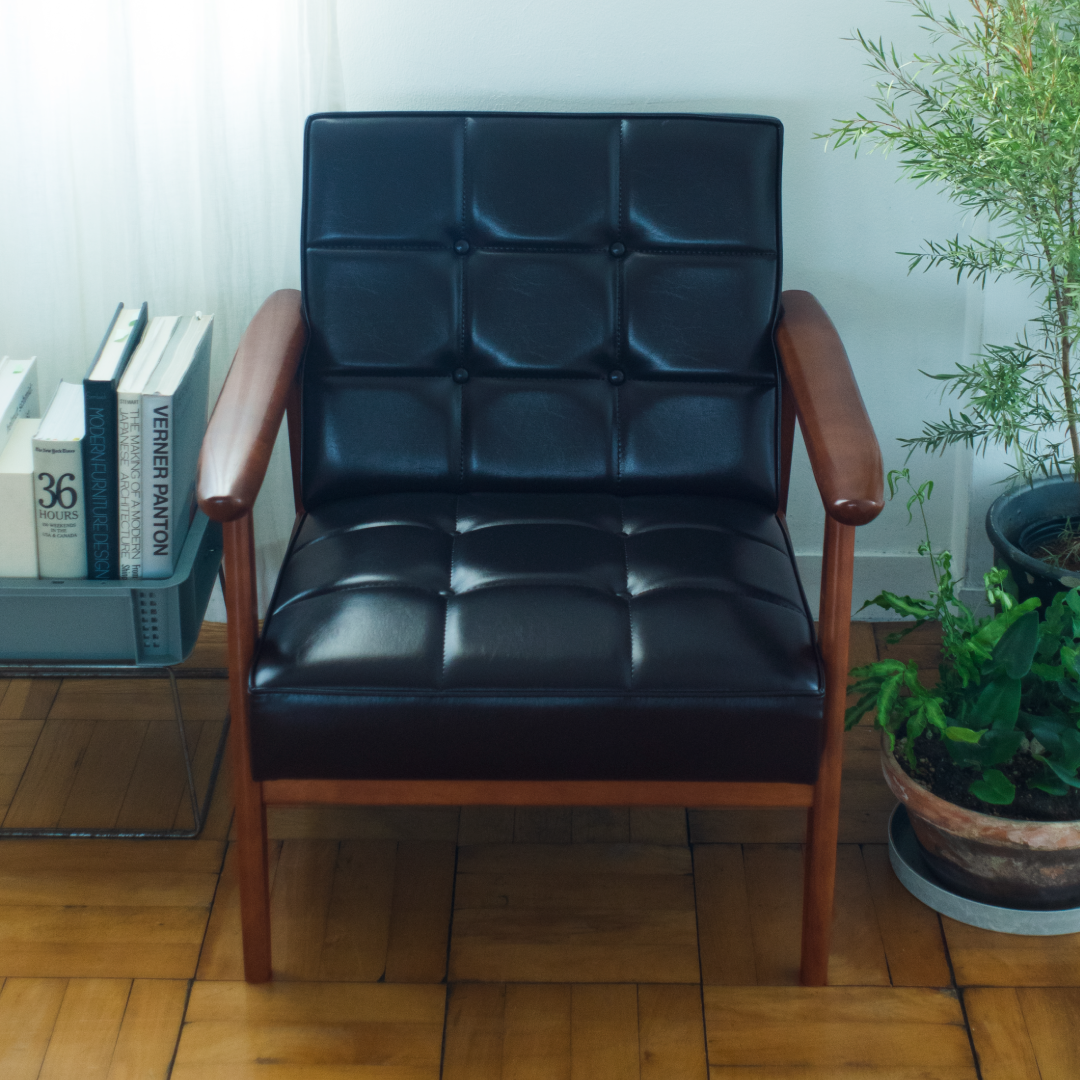 - ► Kチェアは一般的なソファの奥行き85〜100cmより奥行きが70cmと浅めの作りになっているので、小柄な方や高齢者でも座りやすくなっています。身長のある方でも横になるときに肘掛け部分にクッションを置くと比較的ゆっくりできます。スタンダードブラックのKチェアにはモケットブラックのクッションがおすすめです。ぜひ合わせてご検討ください。