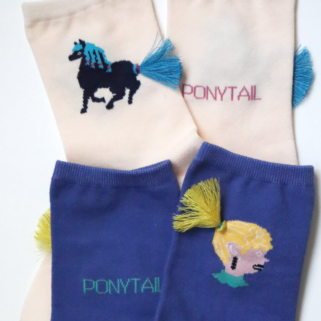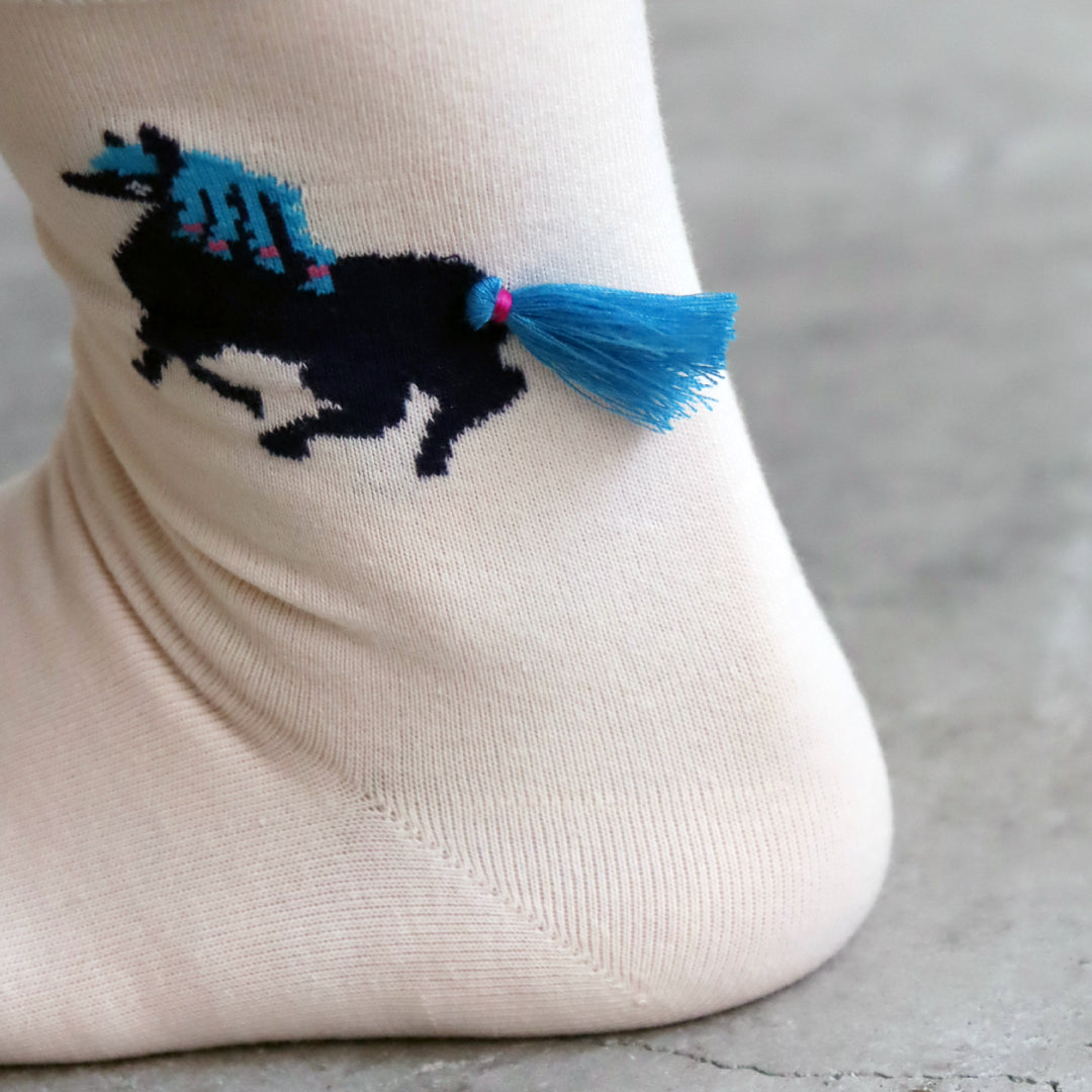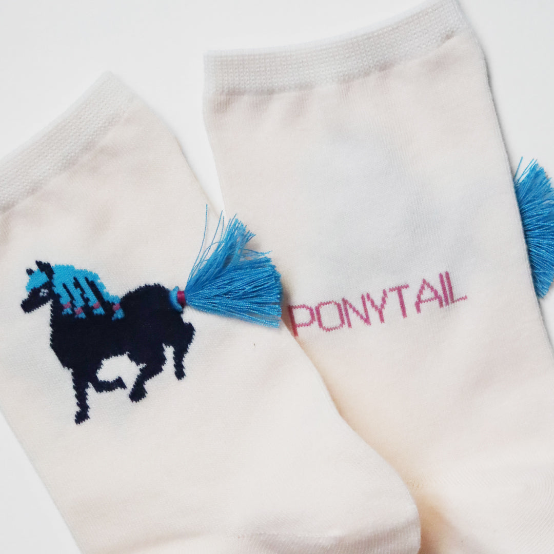 - ► 女の子の髪型と馬のしっぽ、2つのポニーテールをイメージしたタッセルが足首でフリフリと揺れます。他にはないユニークで可愛いデザインで、いつものコーディネートに遊び心をプラスできます。