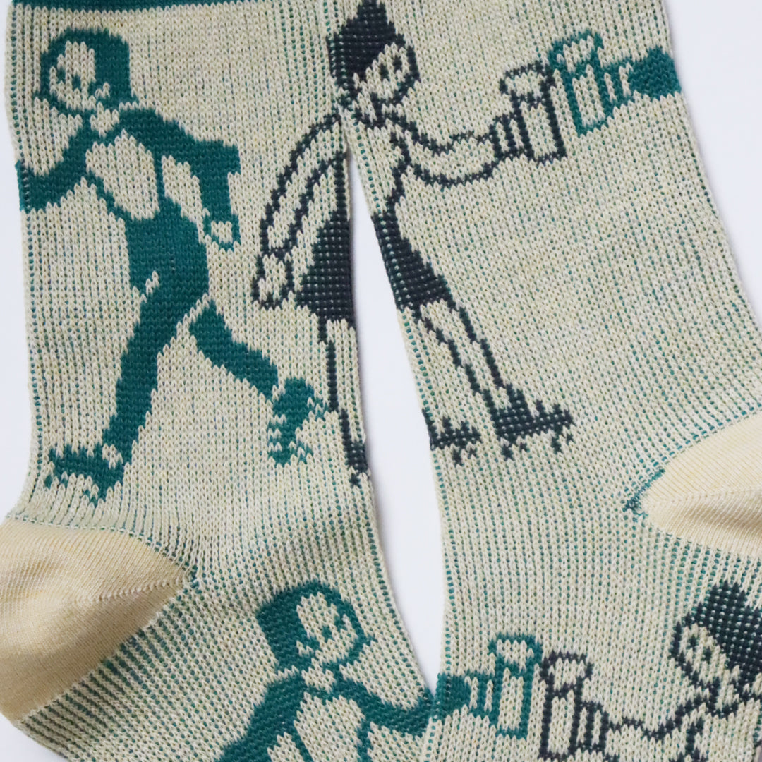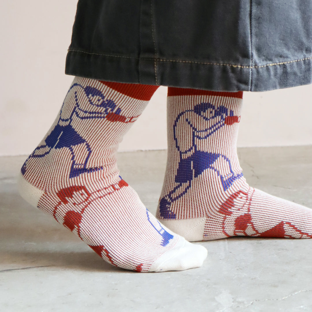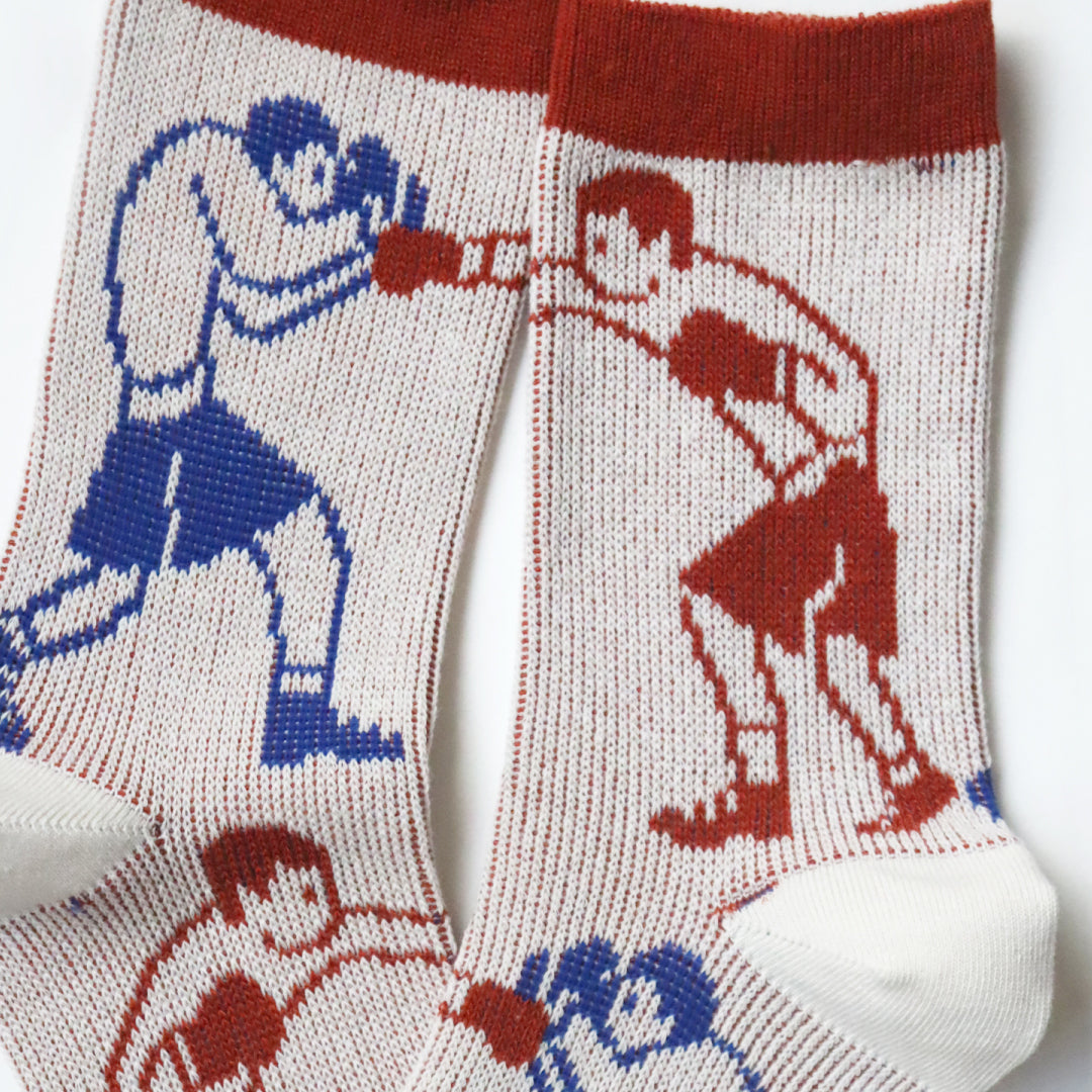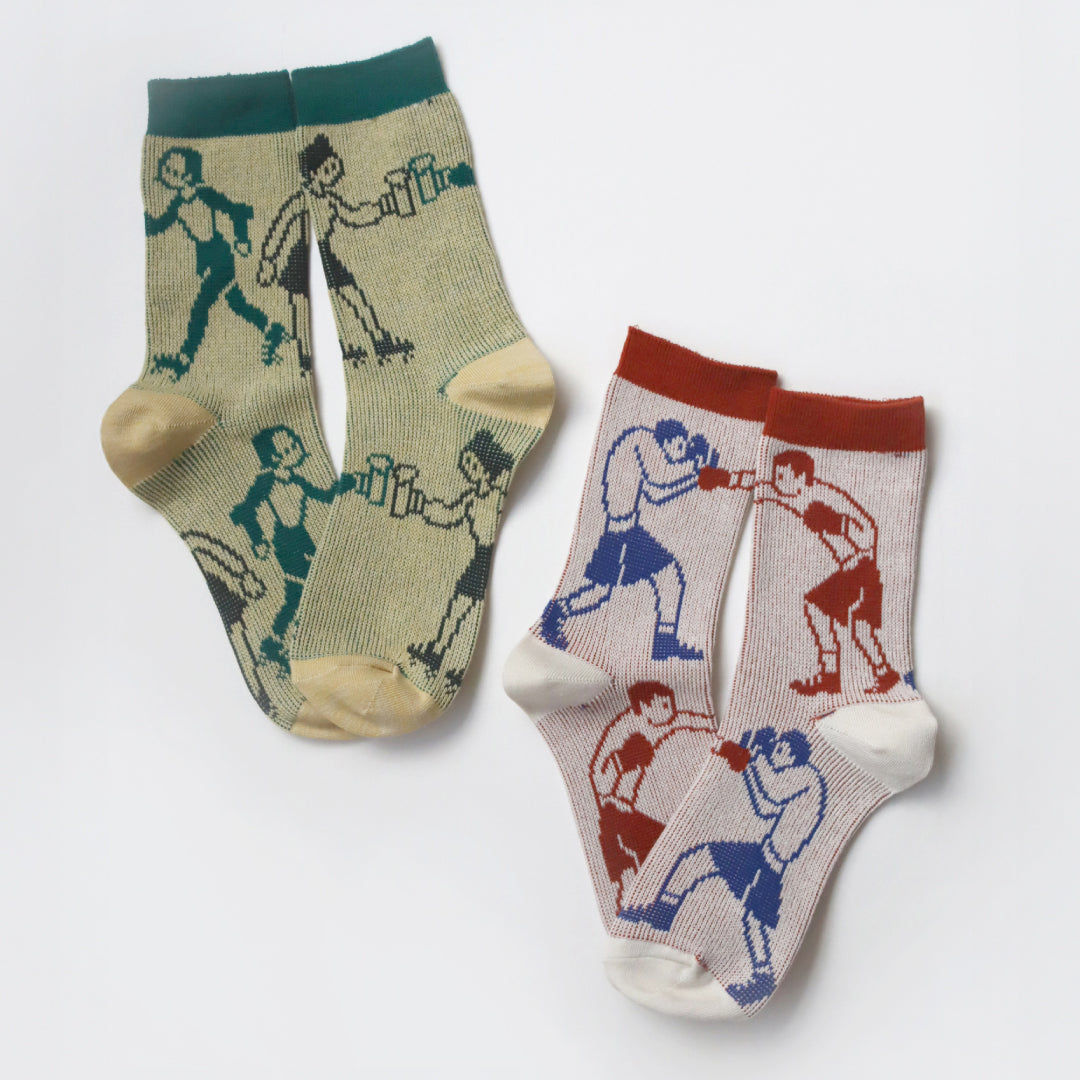 - ► 懐かしのファミコン時代を彷彿とさせる、レトロかわいいドット柄のクルーソックスです。 ボクサーとビアガールという、個性的でユニークなモチーフが足元のおしゃれを演出します。