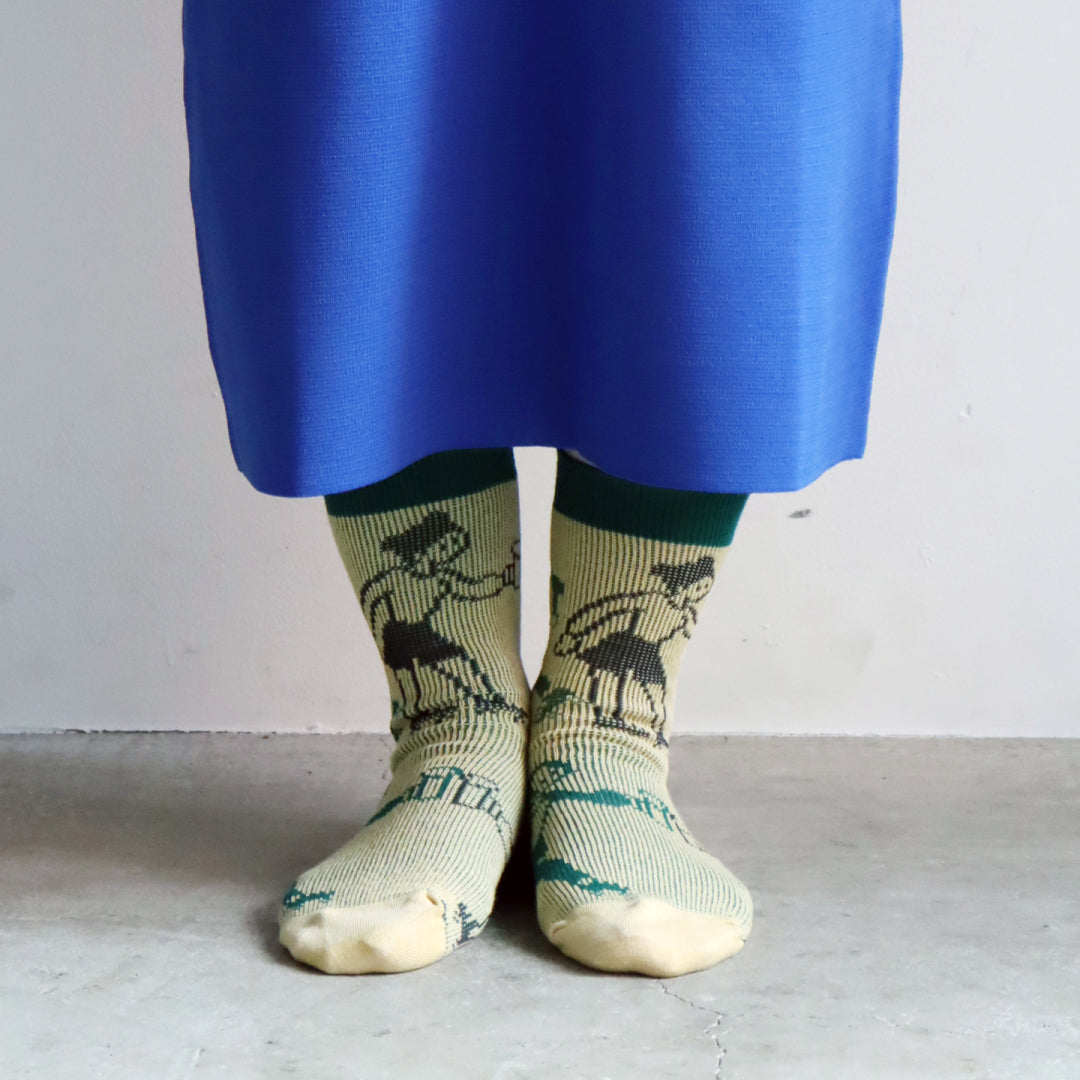 - ► クリエイティブ、フォークロア、シュール、ナチュラル、ポップ、フェミニン等、多種多様な要素を取り入れ、1ブランドでありながら複数ブランドであるかのような不思議な世界観もった靴下と服飾雑貨のブランドです。