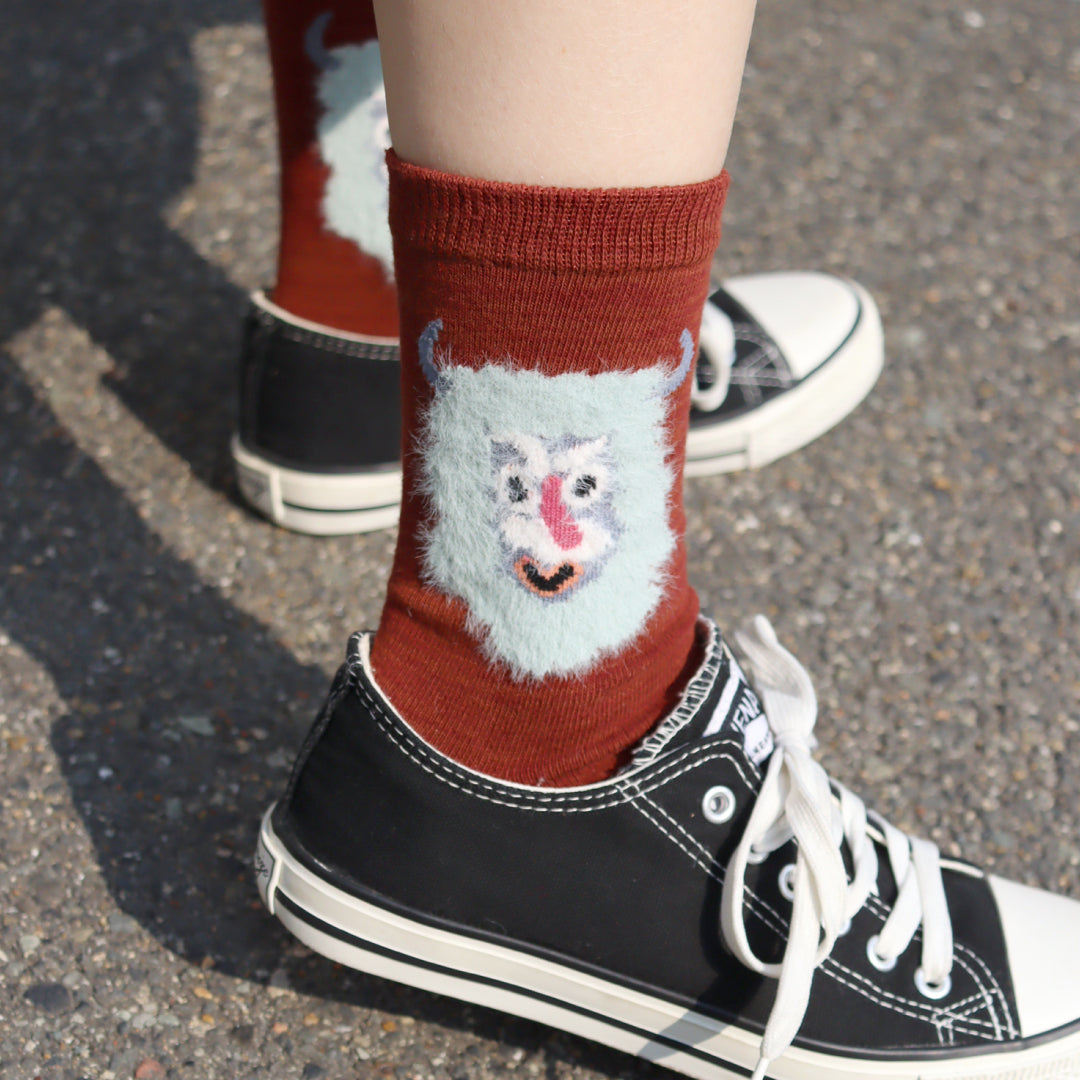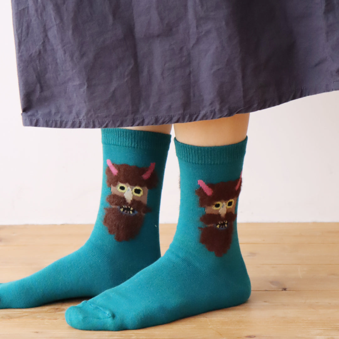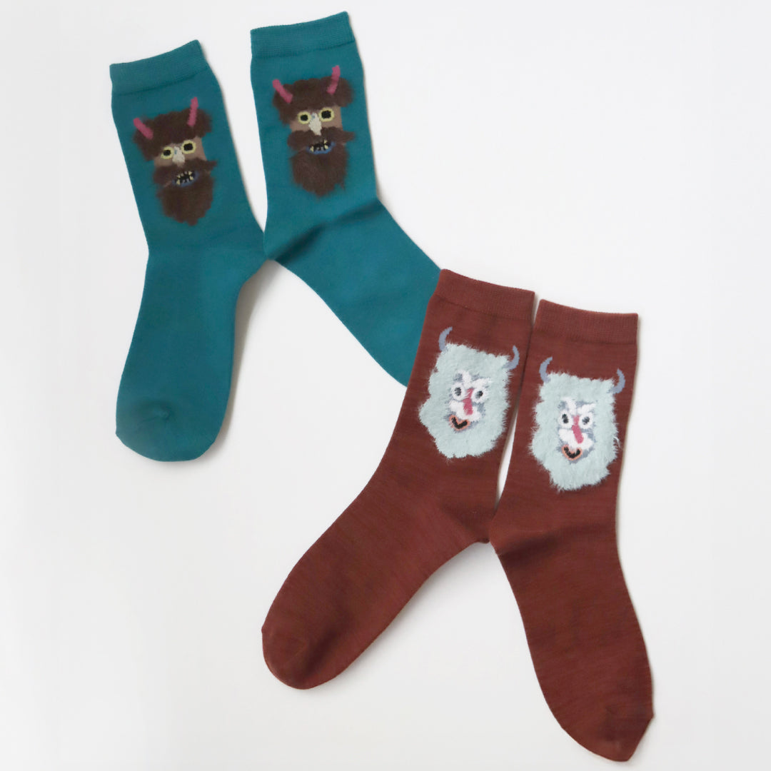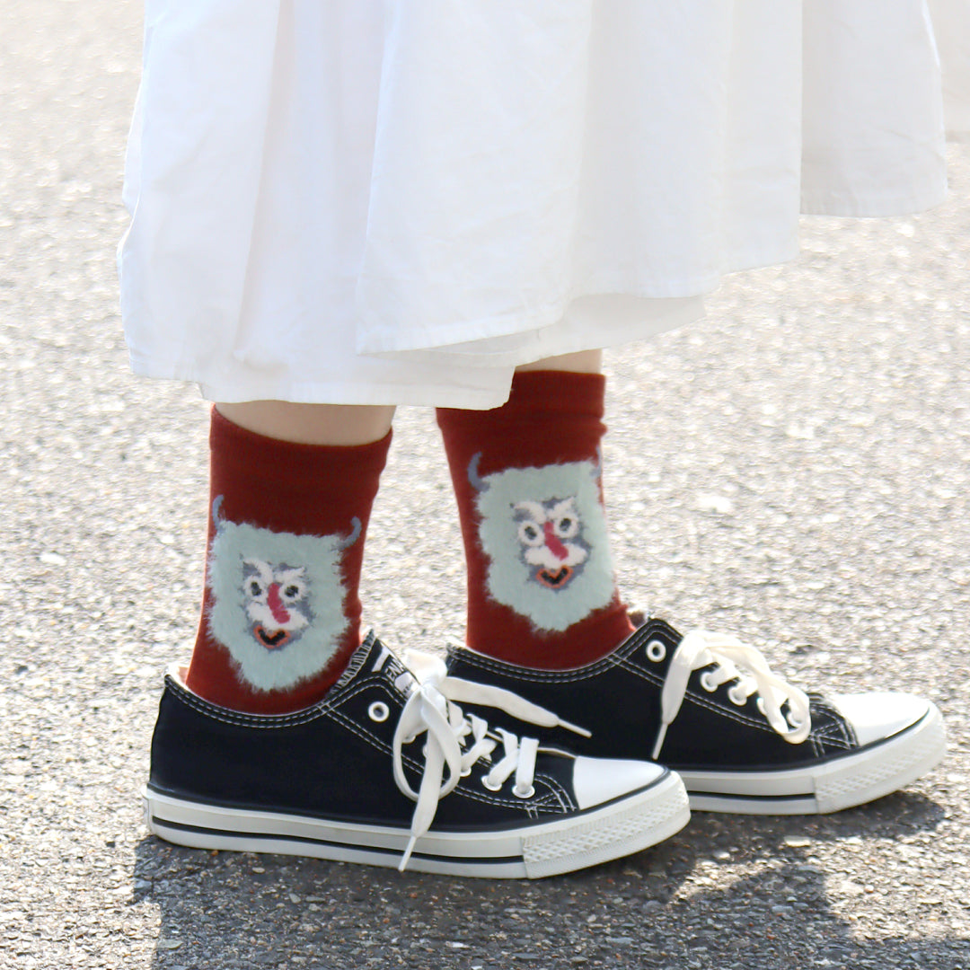KIVISDOU きびす堂|【2足組】ふさふさの仮面 クルーソックス|フォークロアデザインのユニーク総柄で足元に個性を|k41028