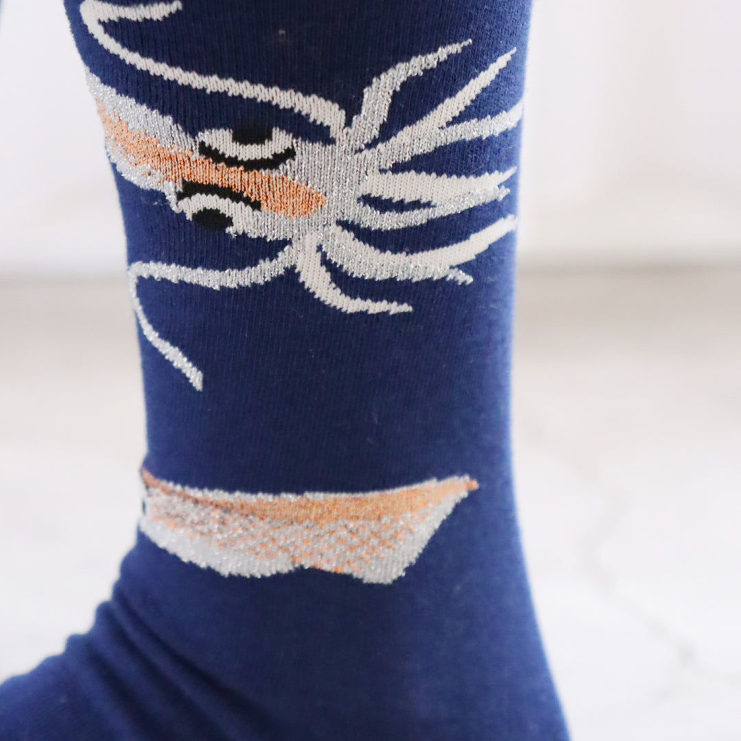 - ► この靴下の最大の魅力は、細部にまでこだわったリアルな質感です。トラフグのキラキラとした黒い皮にはラメ糸を、白い皮にはブークレー糸を使用して、ザラザラとした皮の質感を忠実に再現しました。また、剣先イカは光の加減で色が変わる美しいグラデーションを、ラメ糸と特殊な糸使いで表現。さらに、オレンジ色の部分はイカの肝をイメージしており、食通をうならせるようなマニアックなこだわりが詰まっています。