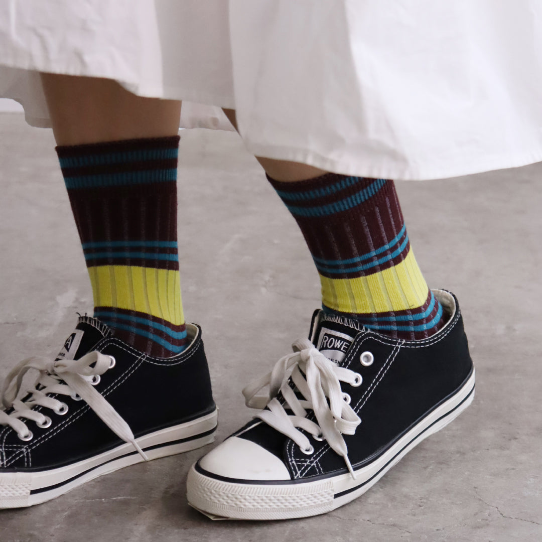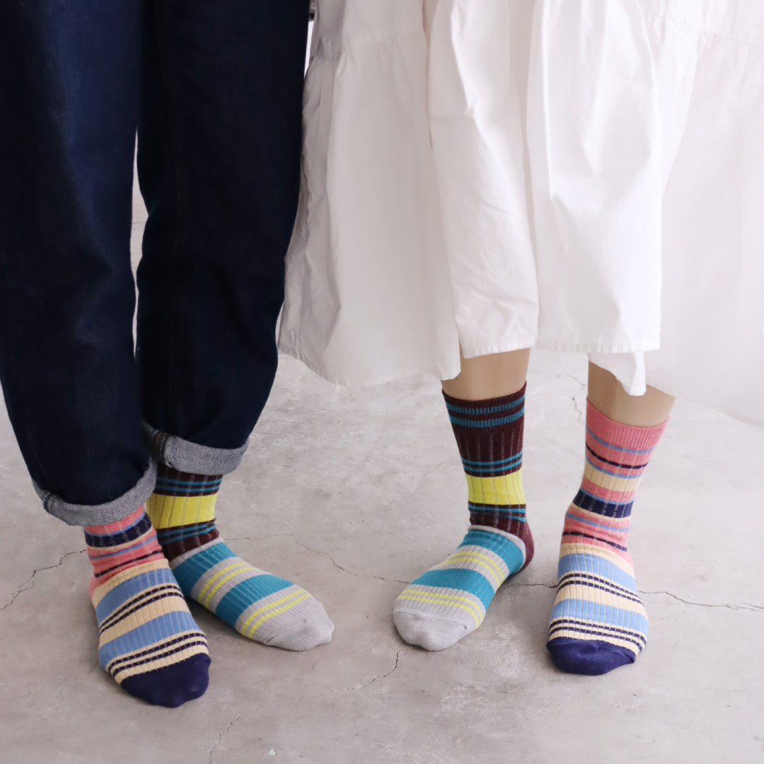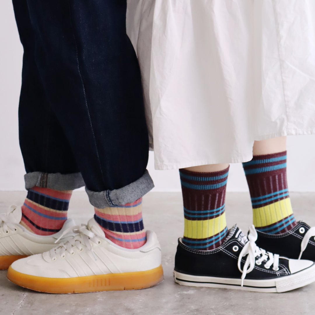 - ► ボーダーソックスと聞くとポップなイメージがあるかもしれませんが、このクルーソックスは大人も履きやすいように、落ち着いたカラーと明るくポップなカラーの組み合わせでデザインしました。落ち着いた色味はコーディネートの引き締め役に、明るい色味はさりげないアクセントになります。リブ仕様で足にしっかりフィットし、快適な履き心地を実現。普段使いはもちろん、オフィスカジュアルにも合わせやすい万能アイテムです。