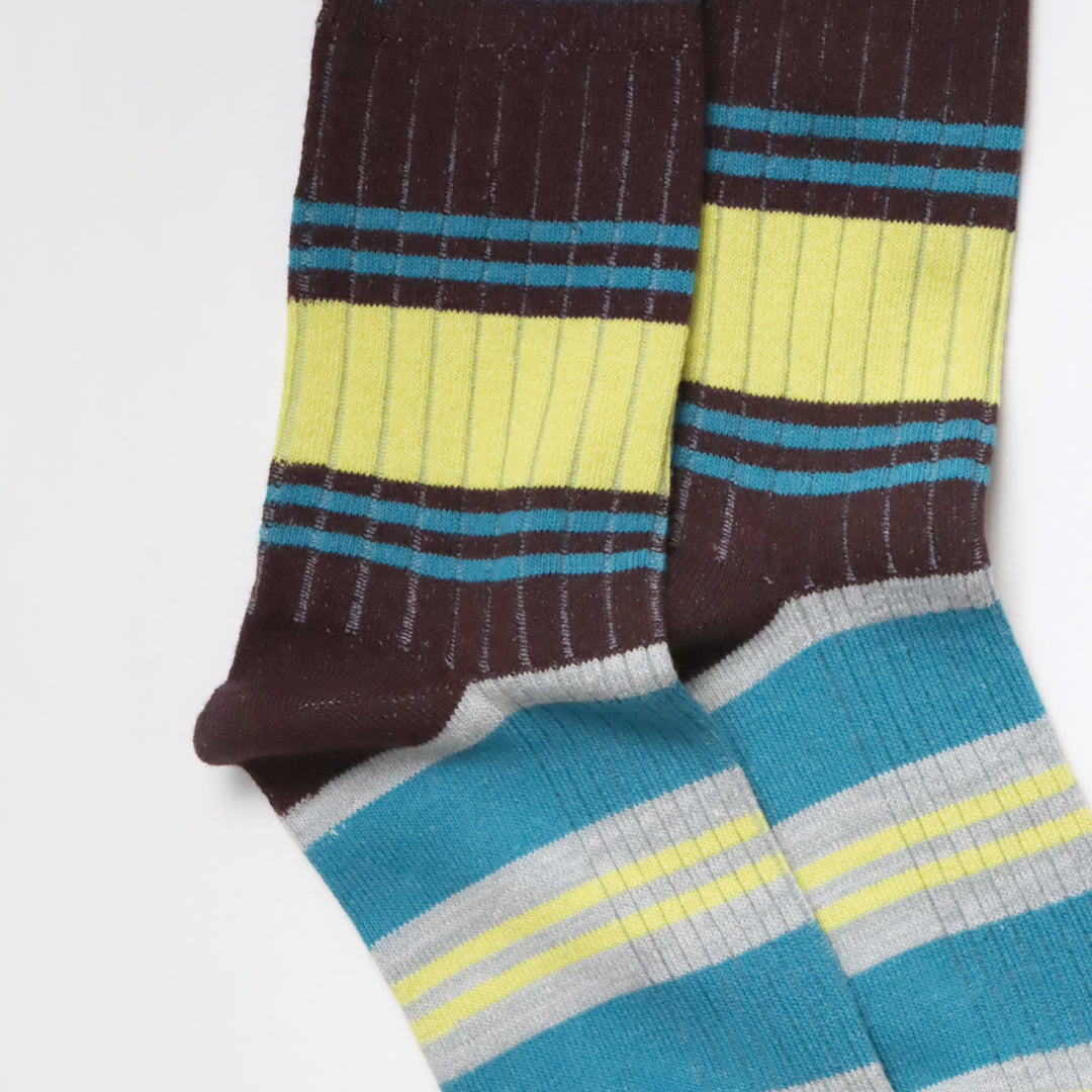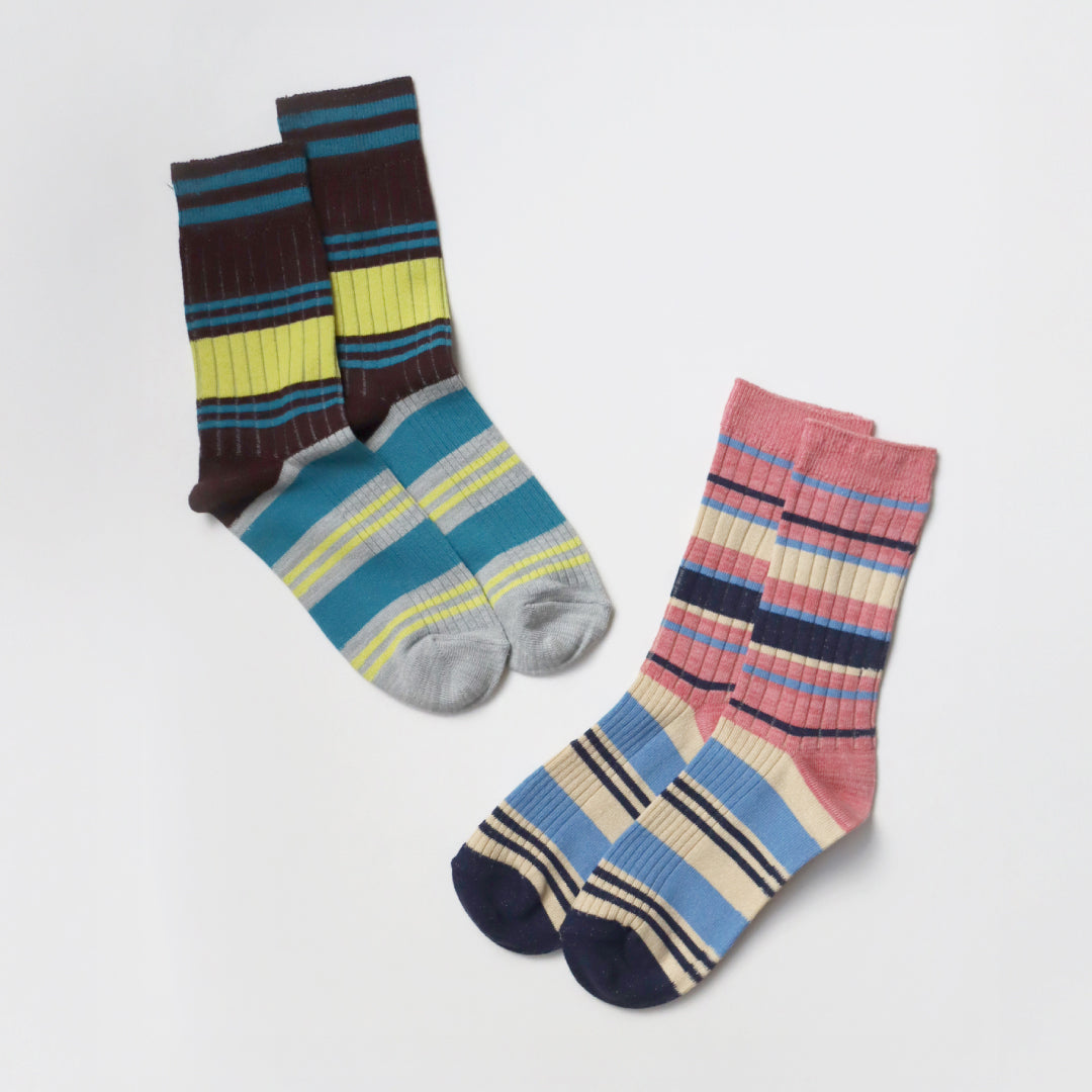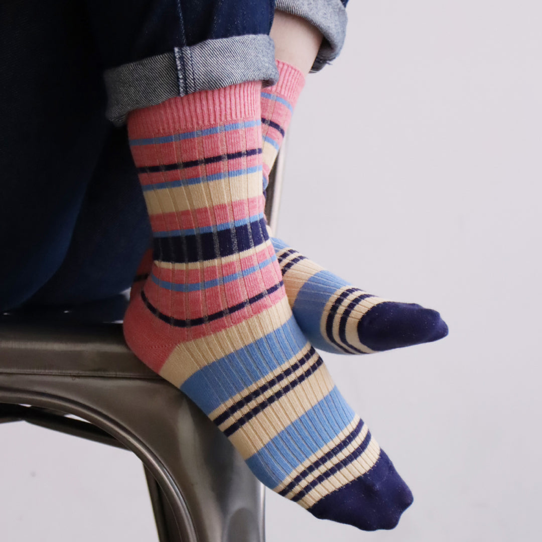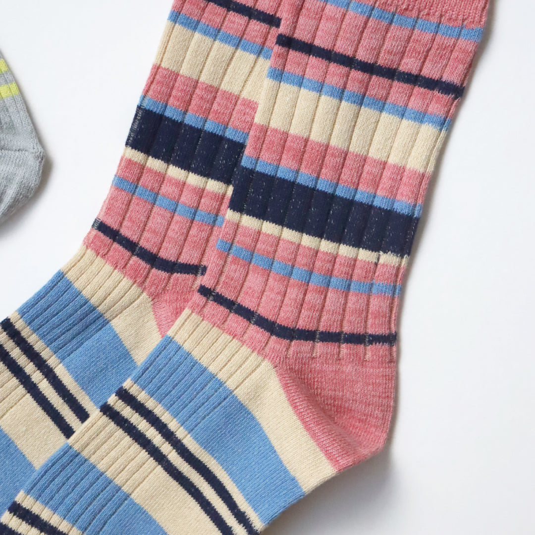 - ► ボーダーソックスと聞くとポップなイメージがあるかもしれませんが、このクルーソックスは大人も履きやすいように、落ち着いたカラーと明るくポップなカラーの組み合わせでデザインしました。落ち着いた色味はコーディネートの引き締め役に、明るい色味はさりげないアクセントになります。リブ仕様で足にしっかりフィットし、快適な履き心地を実現。普段使いはもちろん、オフィスカジュアルにも合わせやすい万能アイテムです。