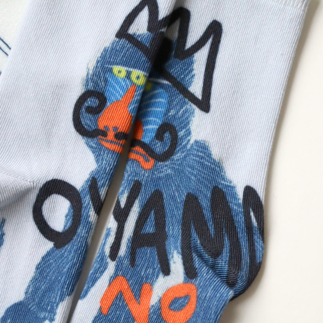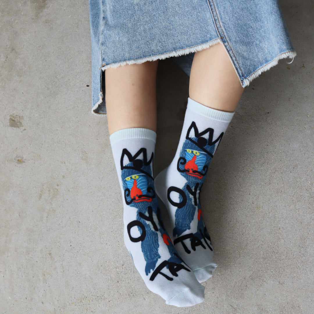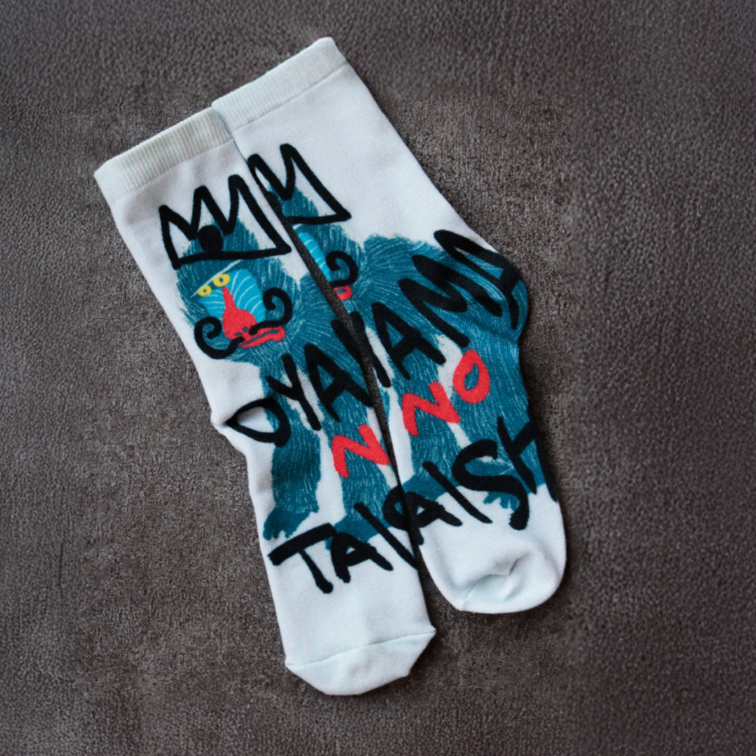 - ► 大きくインパクト大なマンドリルが描かれた1足は、よく見ると「OYAMA NO TAISYOU(お山の大将)」という文字が。足元にさりげないユーモアをプラスします。もう1足は、これまでの靴下デザインをパロディにした総柄。細部までじっくりと見て楽しんでほしい、遊び心満載のアイテムです。