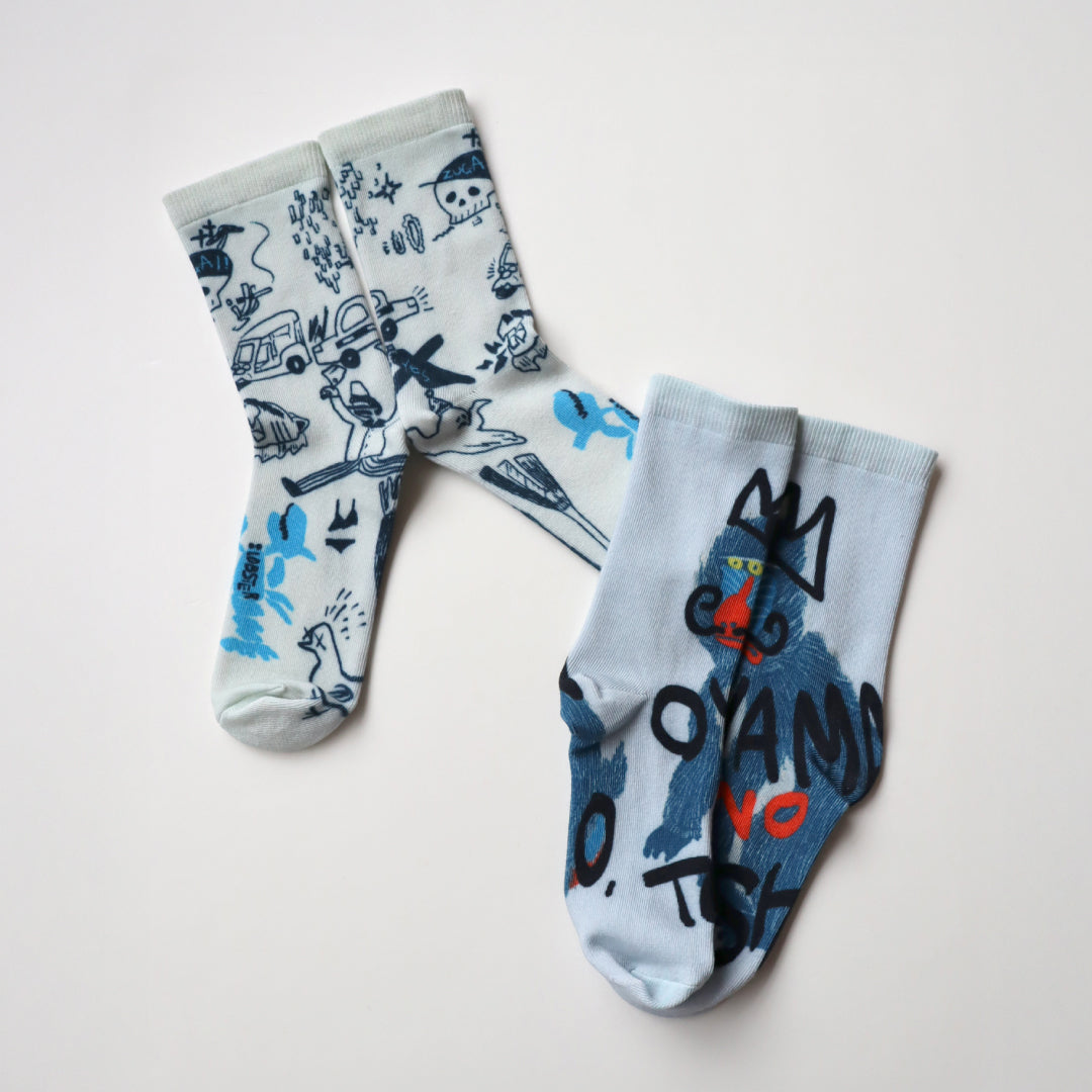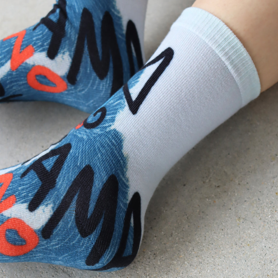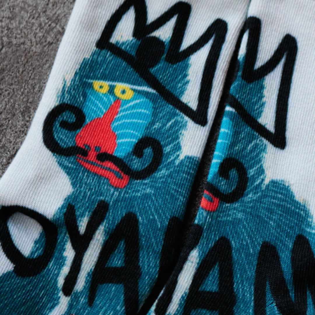 - ► 大きくインパクト大なマンドリルが描かれた1足は、よく見ると「OYAMA NO TAISYOU(お山の大将)」という文字が。足元にさりげないユーモアをプラスします。もう1足は、これまでの靴下デザインをパロディにした総柄。細部までじっくりと見て楽しんでほしい、遊び心満載のアイテムです。