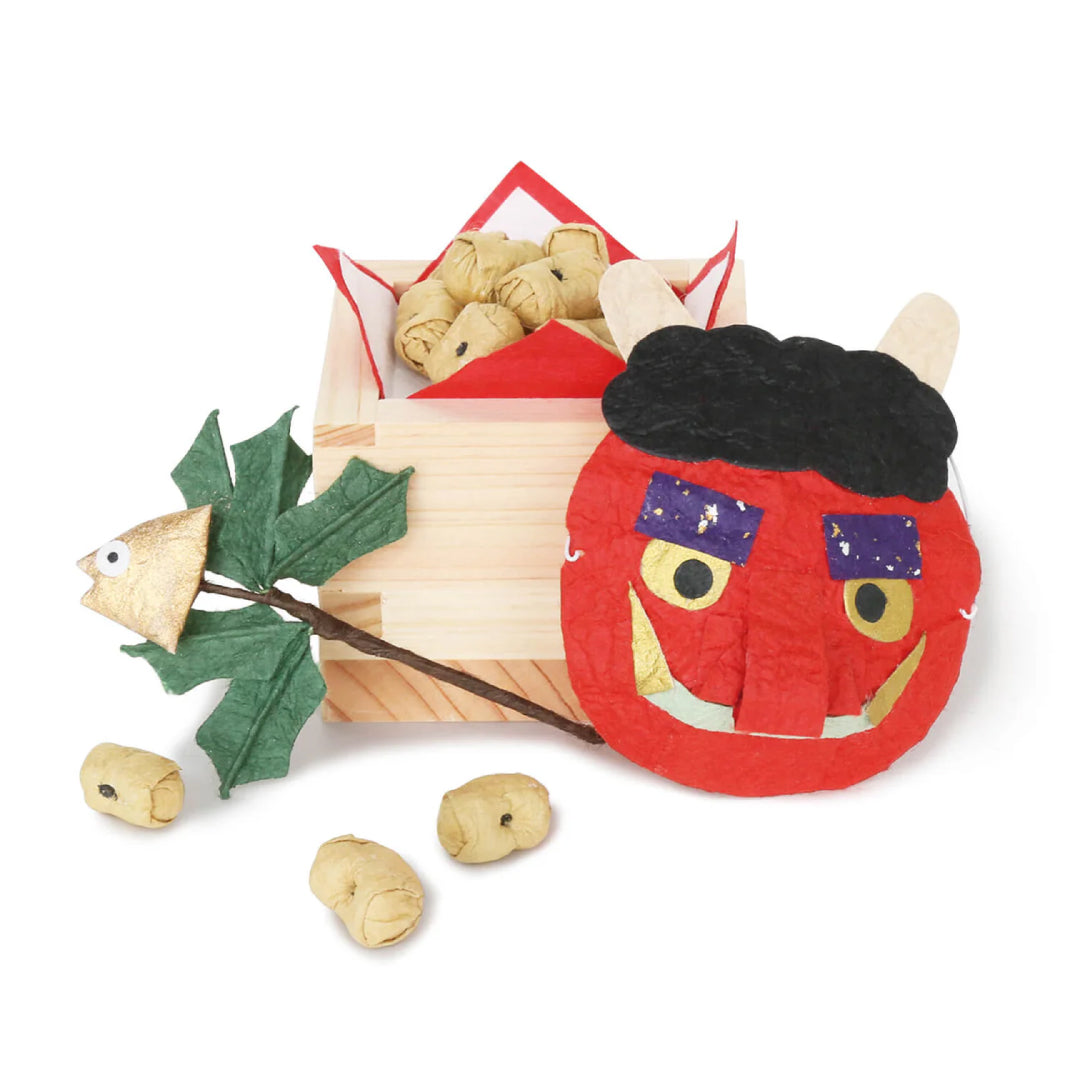 - ► 厳しい冬を越え、輝かしい春を願う「豆まき」の風景を、温かみのある和紙で小さなお飾りに仕立てました。 赤鬼のお面、升入りの豆、柊鰯(ひいらぎいわし)がセットになり、日本の伝統行事を身近に感じさせてくれます。