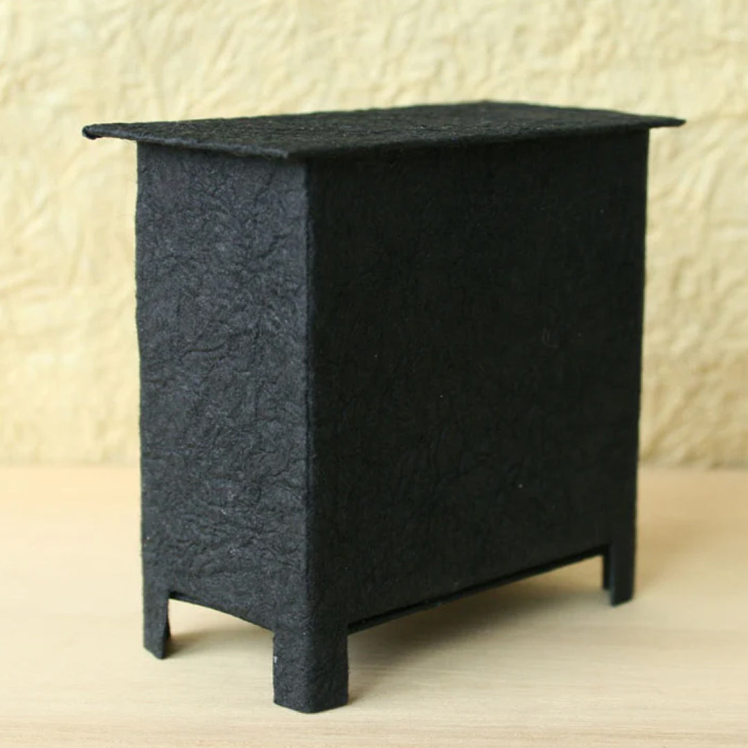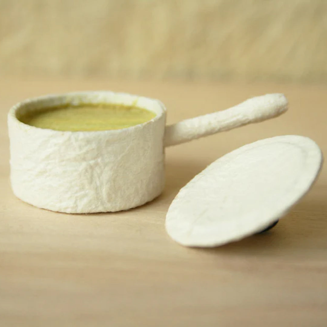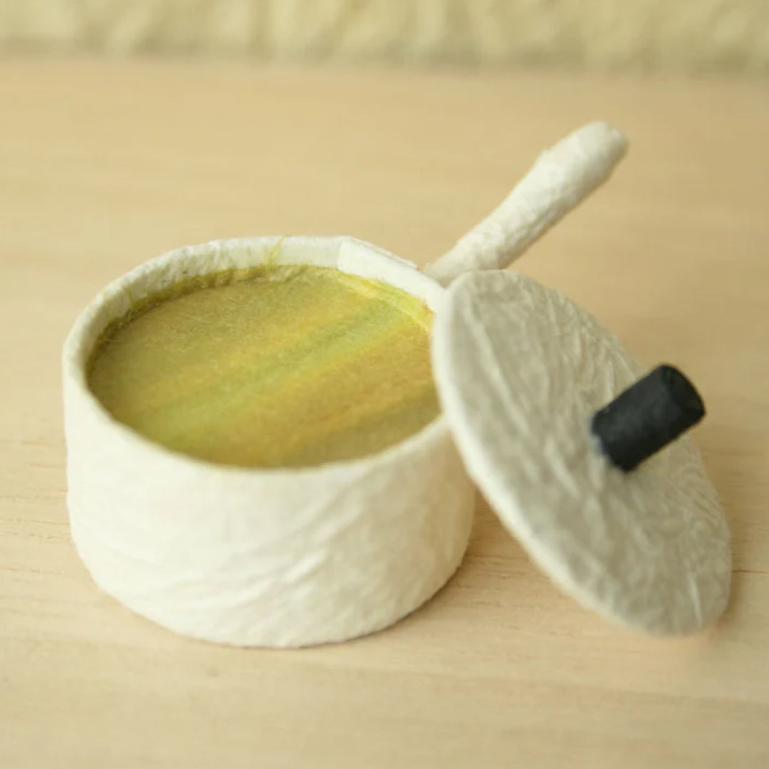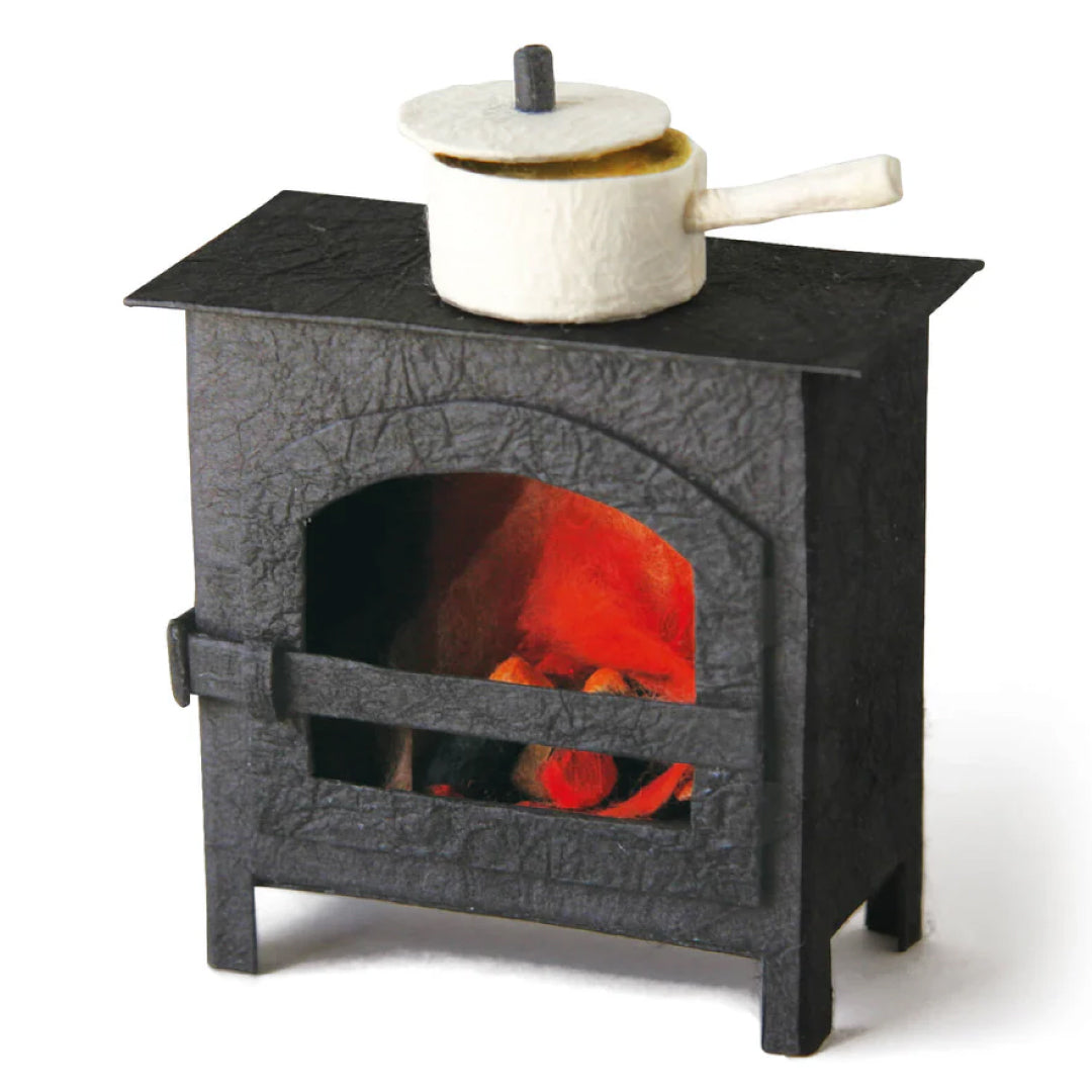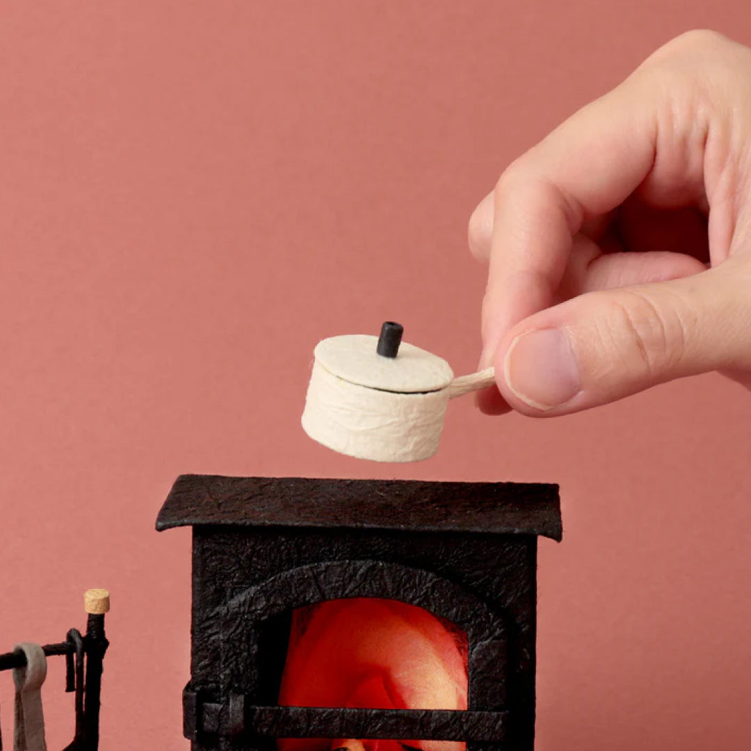 - ► 「めでたや遊び 暖炉」は、冬の室礼にぴったりな手のひらサイズのミニチュア暖炉と片手鍋のセットです。伝統的な和紙職人の技術を活かし、細部まで丁寧に作り込まれています。開閉できる暖炉の扉を開けると、本物の豆炭を模した和紙と赤い和紙でできた「燃える炭」が現れ、まるで本物の暖炉のような温かみを感じさせます。炭以外はすべて和紙で作られており、日本の伝統工芸の繊細さを感じていただけます。