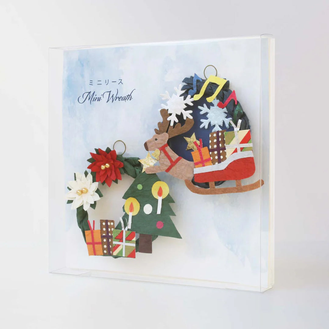 - ► 「めでたや」の「ミニリース クリスマス」は、クリスマスの夜の心温まるストーリーを、手のひらサイズの小さなリースに閉じ込めた商品です。ソリを引くトナカイと、美しく飾り付けられたクリスマスツリーの2つがセットになっています。直径わずか6cmのミニリースは、デスクや棚、壁など、ちょっとしたスペースを彩るのにぴったりです。