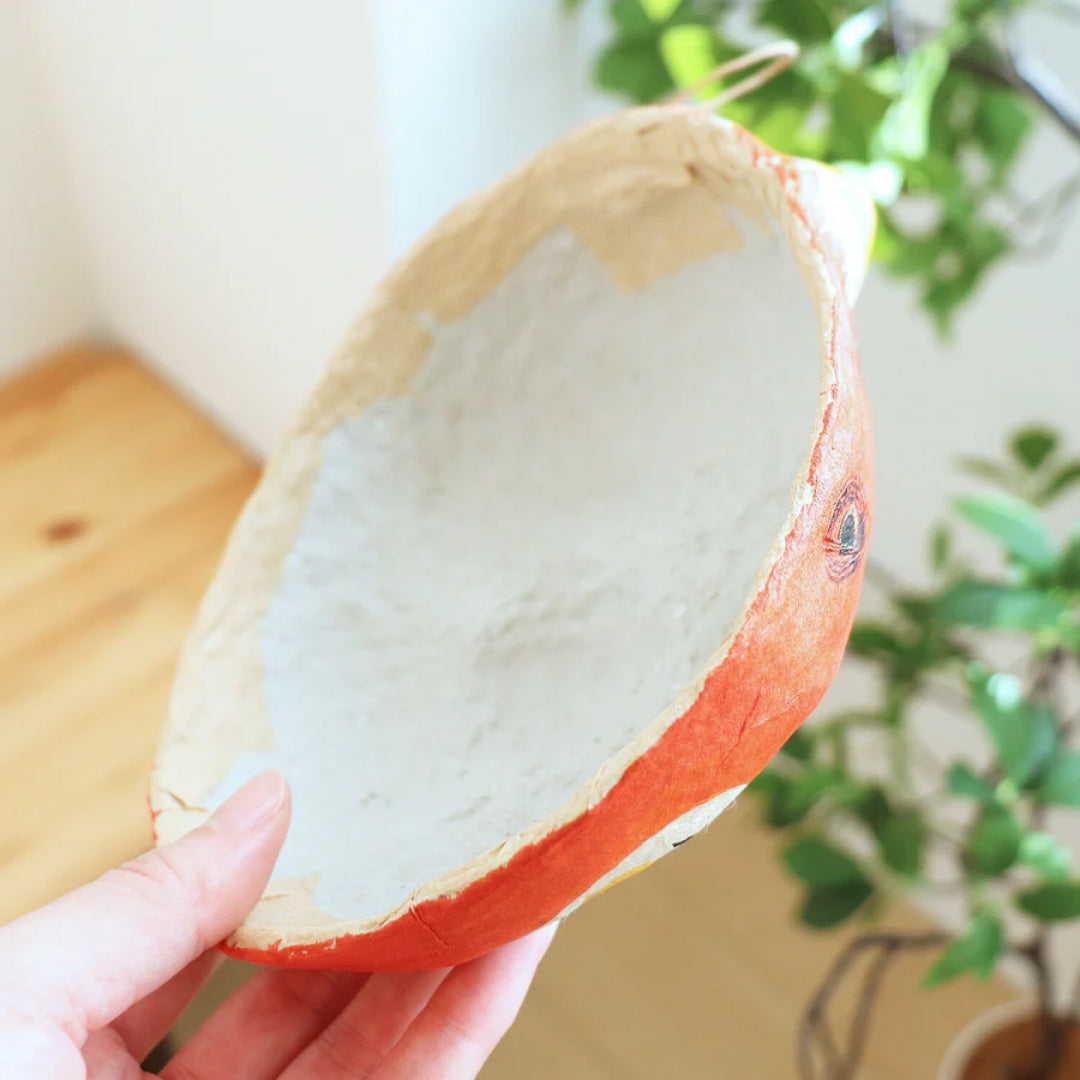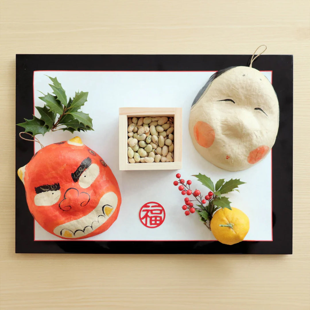 - ► 一枚一枚和紙を貼り重ね、一点ずつ丁寧に描き上げられた「めでたや」の張り子鬼面です。手作りならではの温かみと、どこかユーモラスで愛嬌のある表情が、節分のしつらえに明るい彩りを添えてくれます。