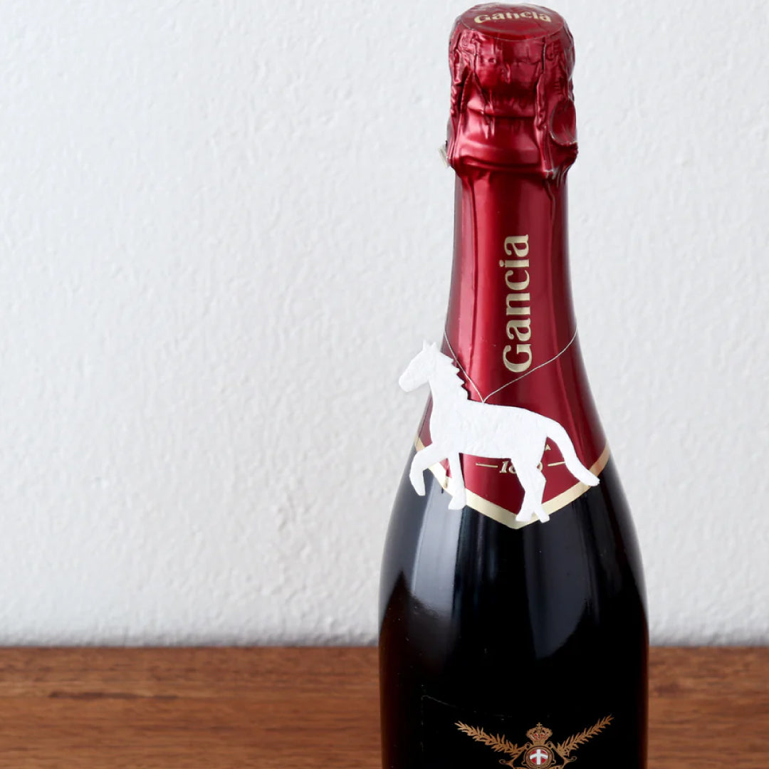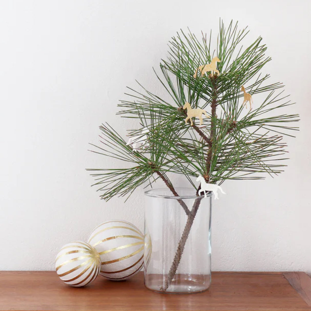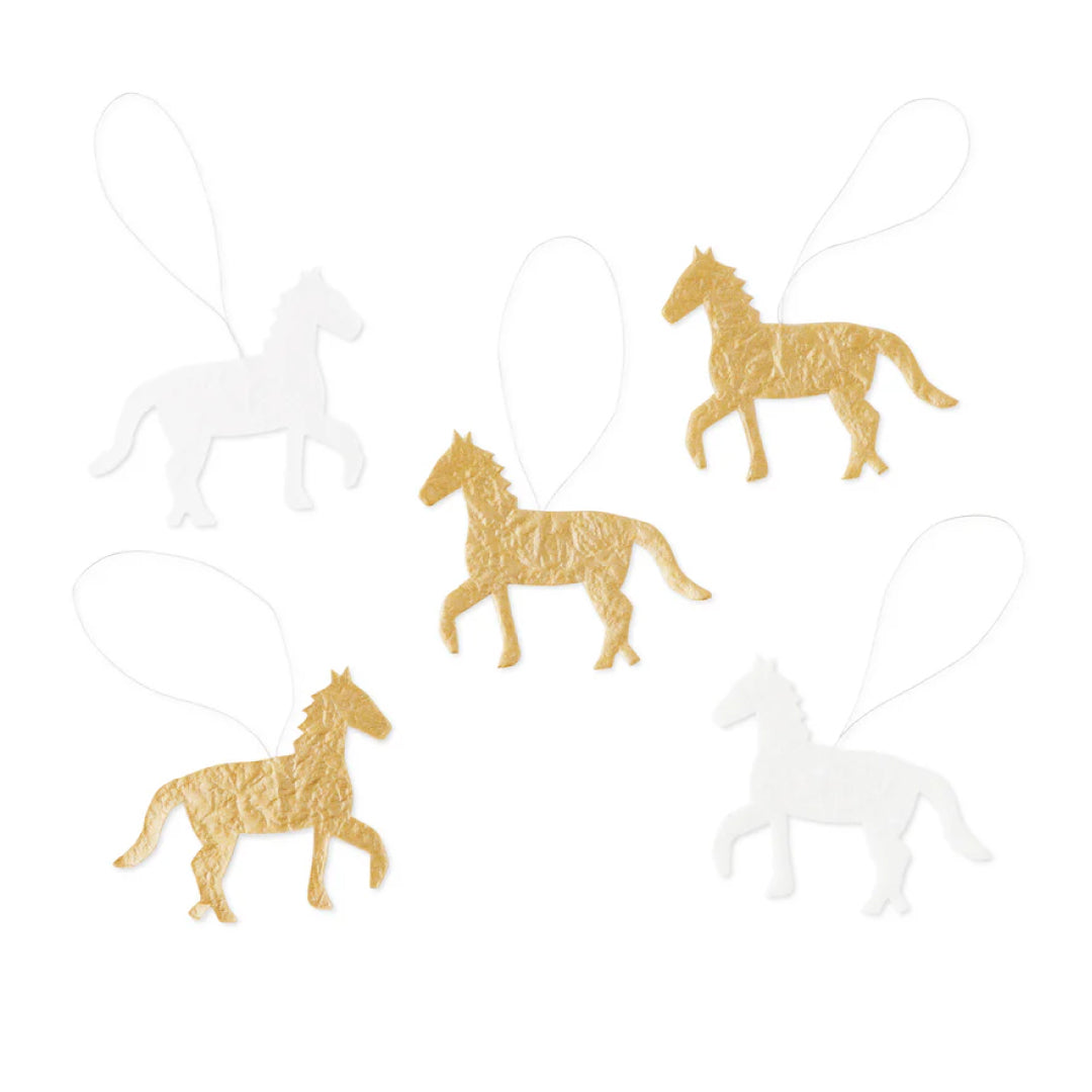 - ► 光沢のある白と輝く金色の馬モチーフを両面仕様にした吊るし飾りです。 馬は名刺の半分くらいのサイズで、銀糸付きの5枚セット。 午年のお正月飾りを手軽に演出する和モダンアイテムです。