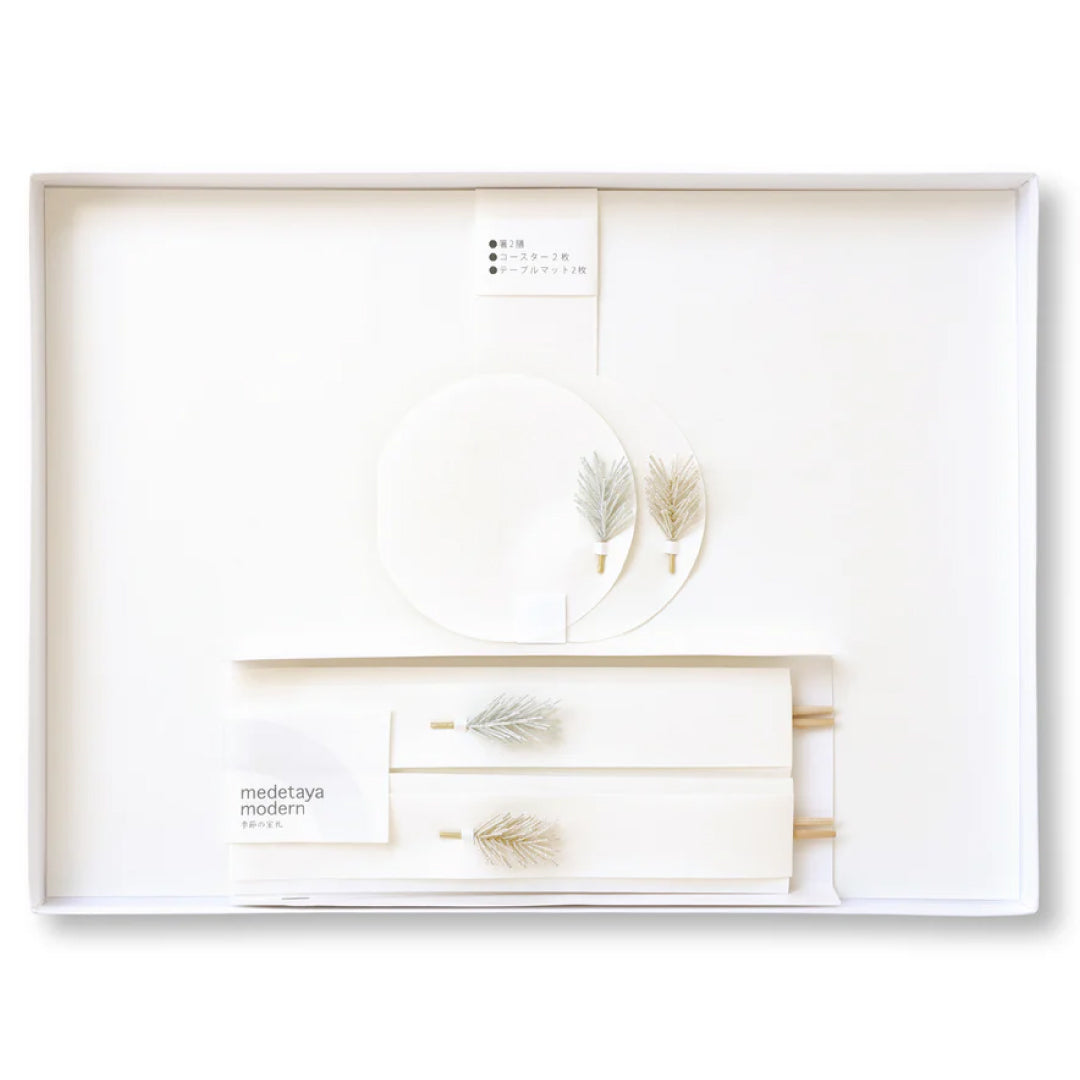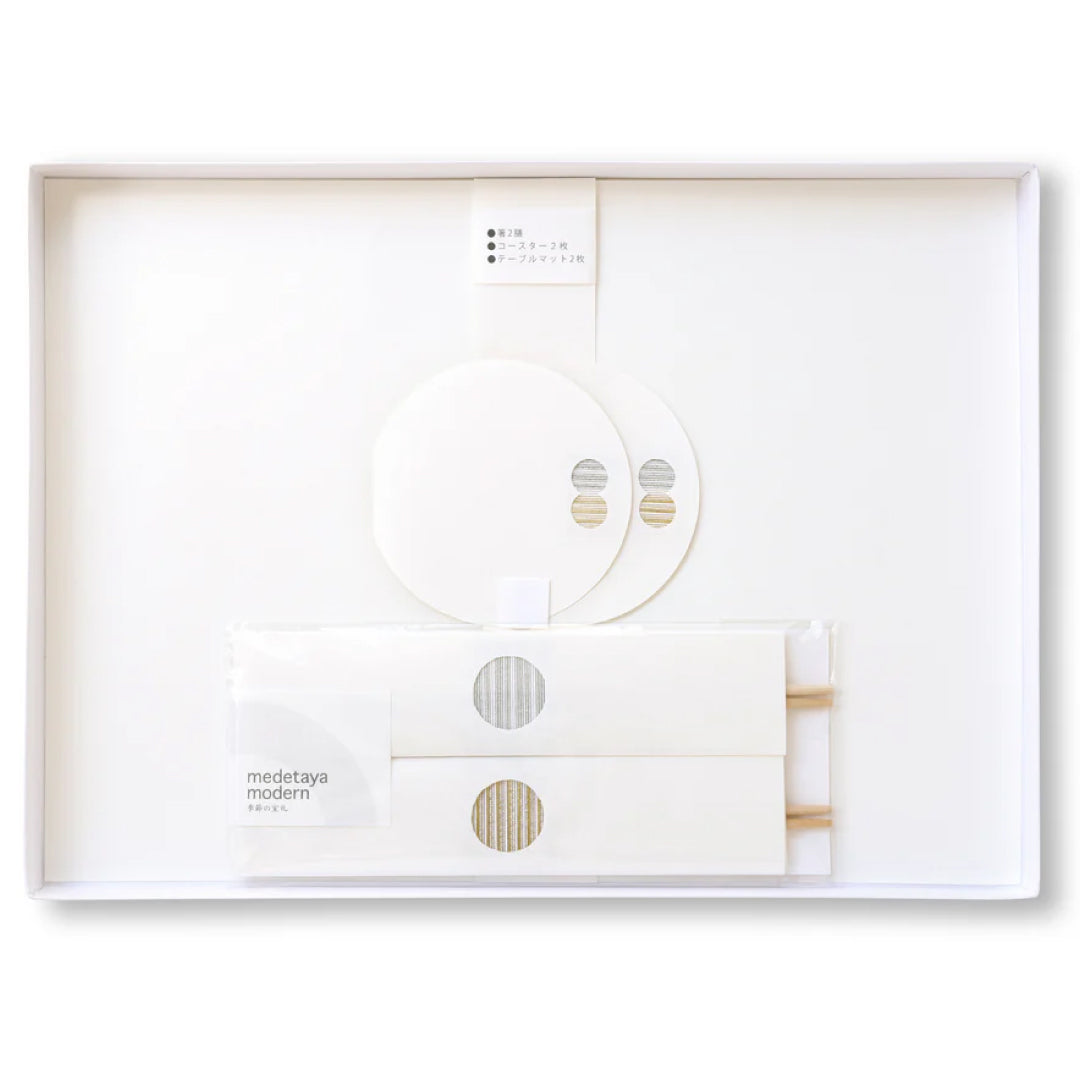 - ► 祝箸、コースター、マットが各2点入った箱入りセットのテーブルウェアです。 手作業で立体的に仕上げた松葉水引が華やかに特別な日を彩ります。 金銀のセットでお祝いの席を上品にコーディネートできます。
