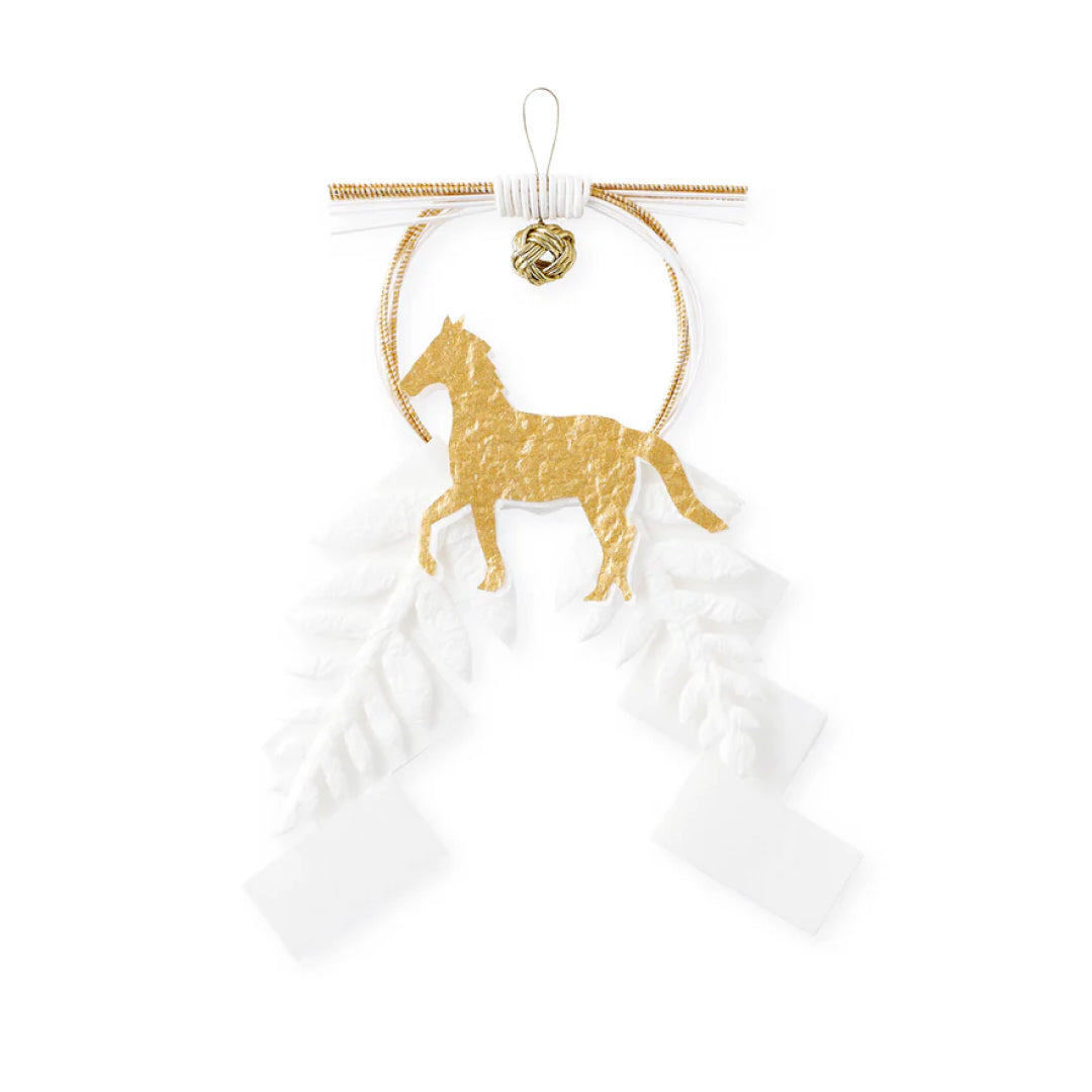 - ► 神聖な馬と紙垂・ウラジロを合わせた縁起の良いお飾りです。金色の馬と水引玉が輝き、両手のひらサイズで午年の干支飾りに最適。 伝統的な要素をモダンに表現した和モダンなデザインです。