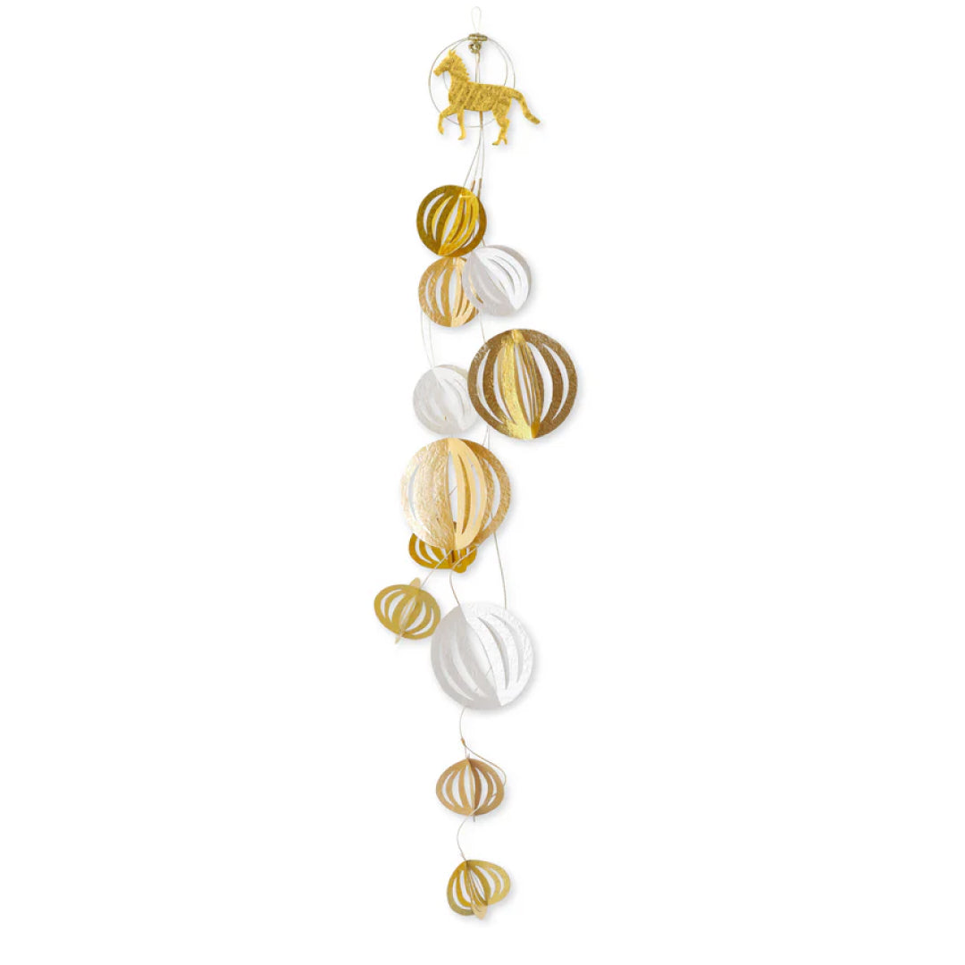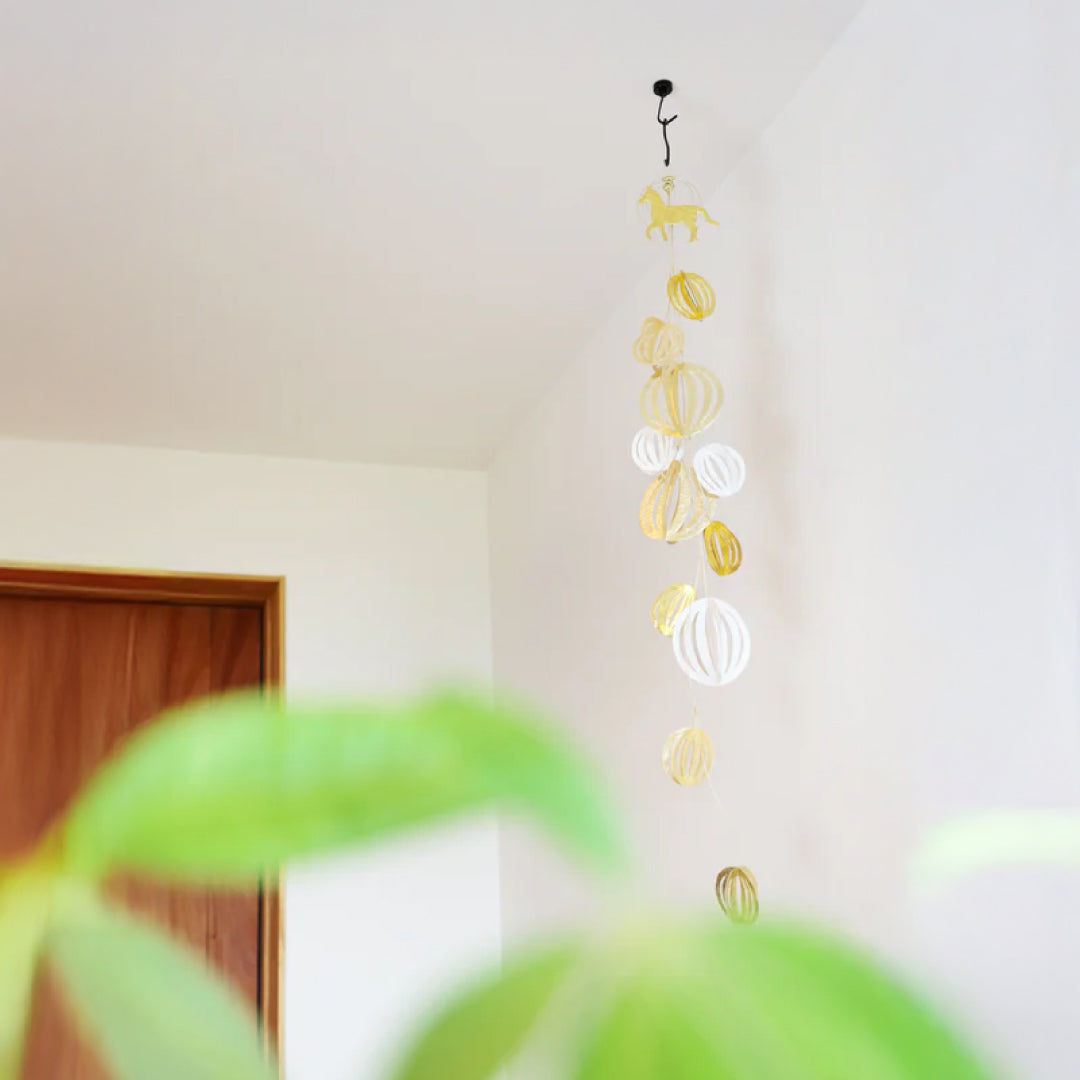 - ► 神聖な馬と立体的な和紙の鞠を鈴生りにした吊るし飾りです。 3種の金色と白の組み合わせが表情豊かでモダンな趣き。 和洋さまざまなインテリアに美しく馴染むお正月飾りです。