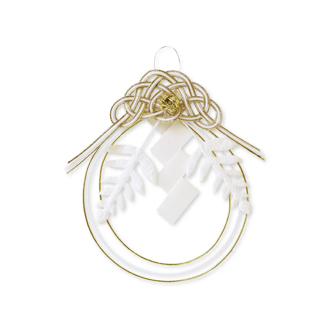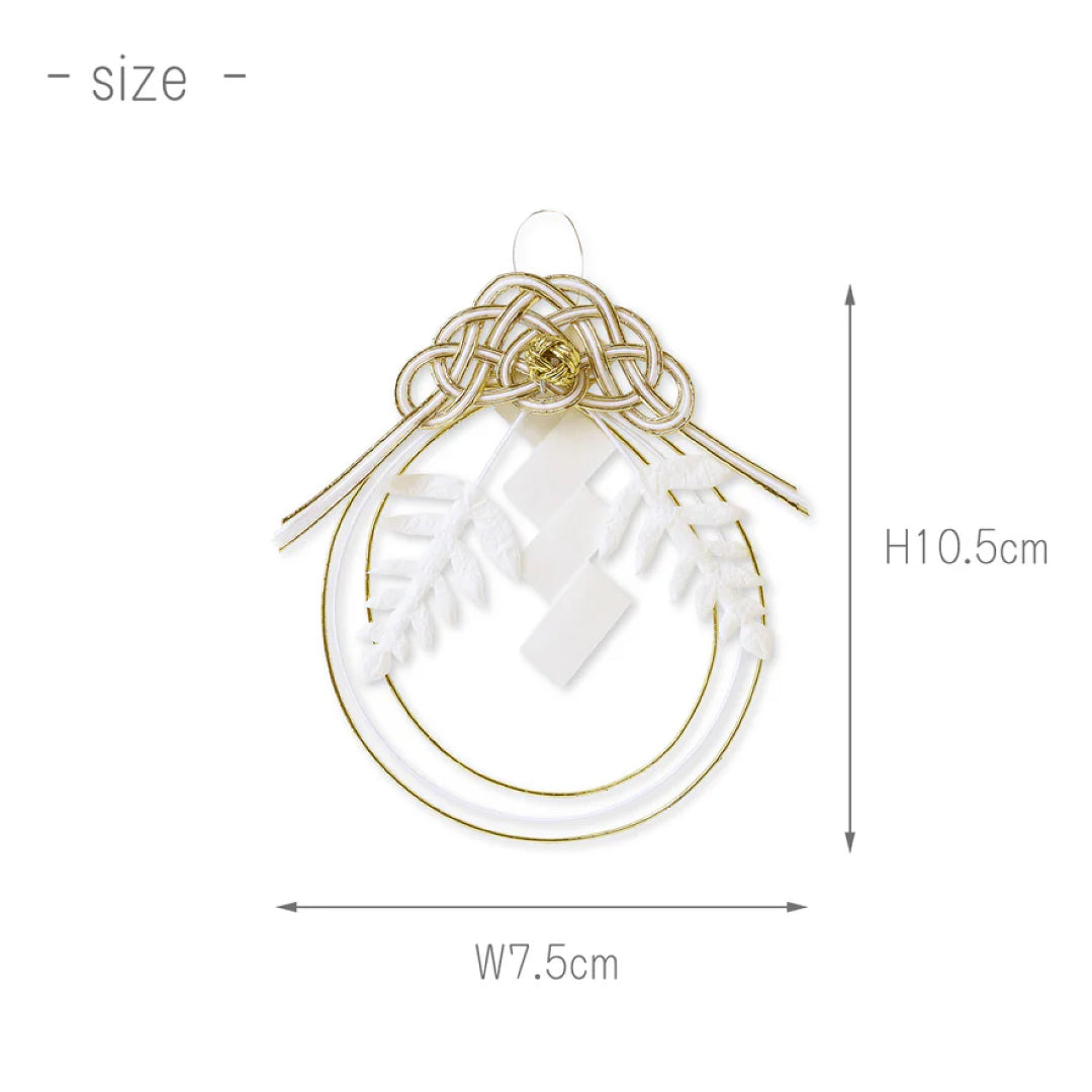 - ► 光沢のある金と白の水引の「松結び」が華やかな小さなお正月飾りです。紙垂とウラジロを重ね、良縁と円満を願う縁起の良いデザイン。片手に収まるミニサイズながら、伝統の要素を凝縮した和モダンなアイテムです。