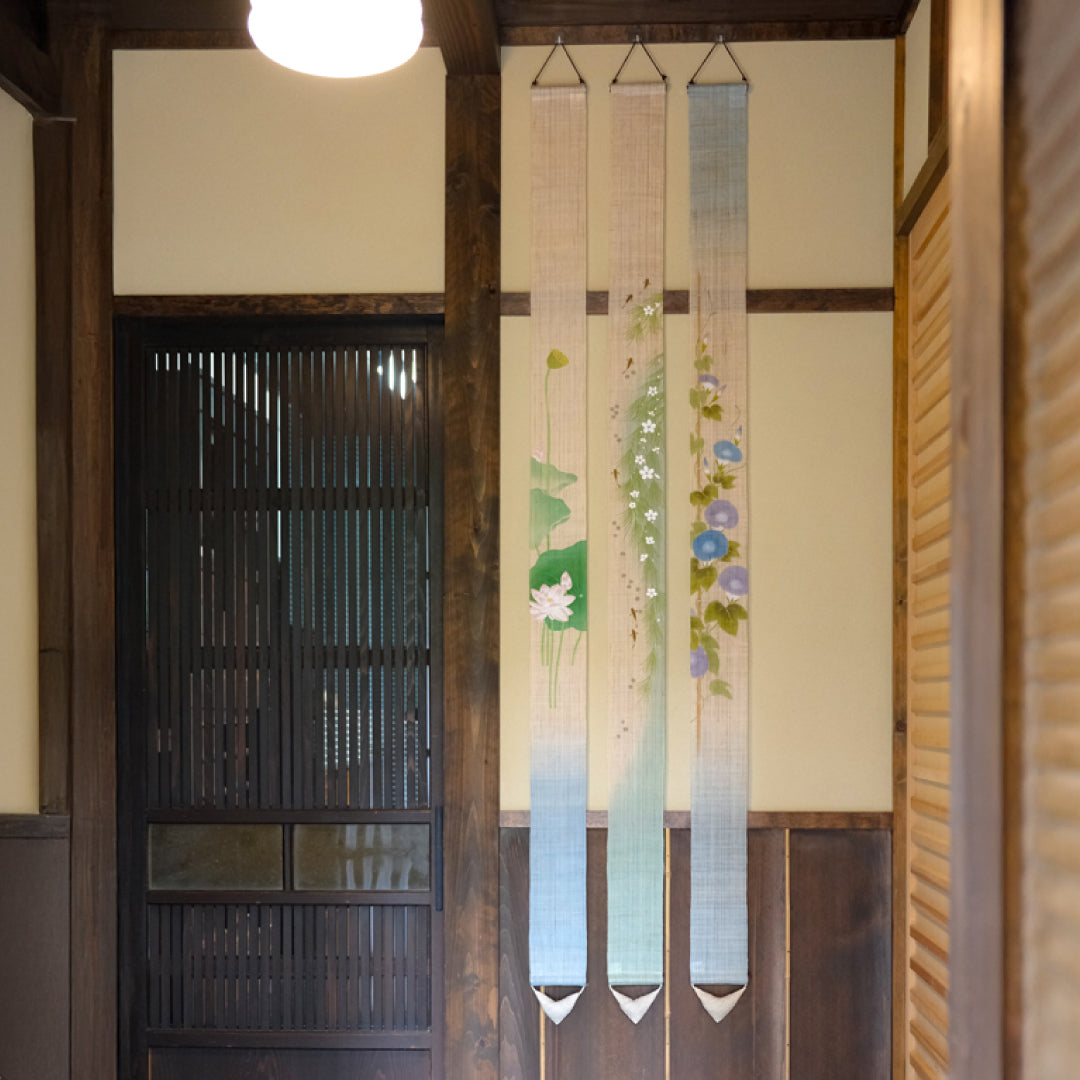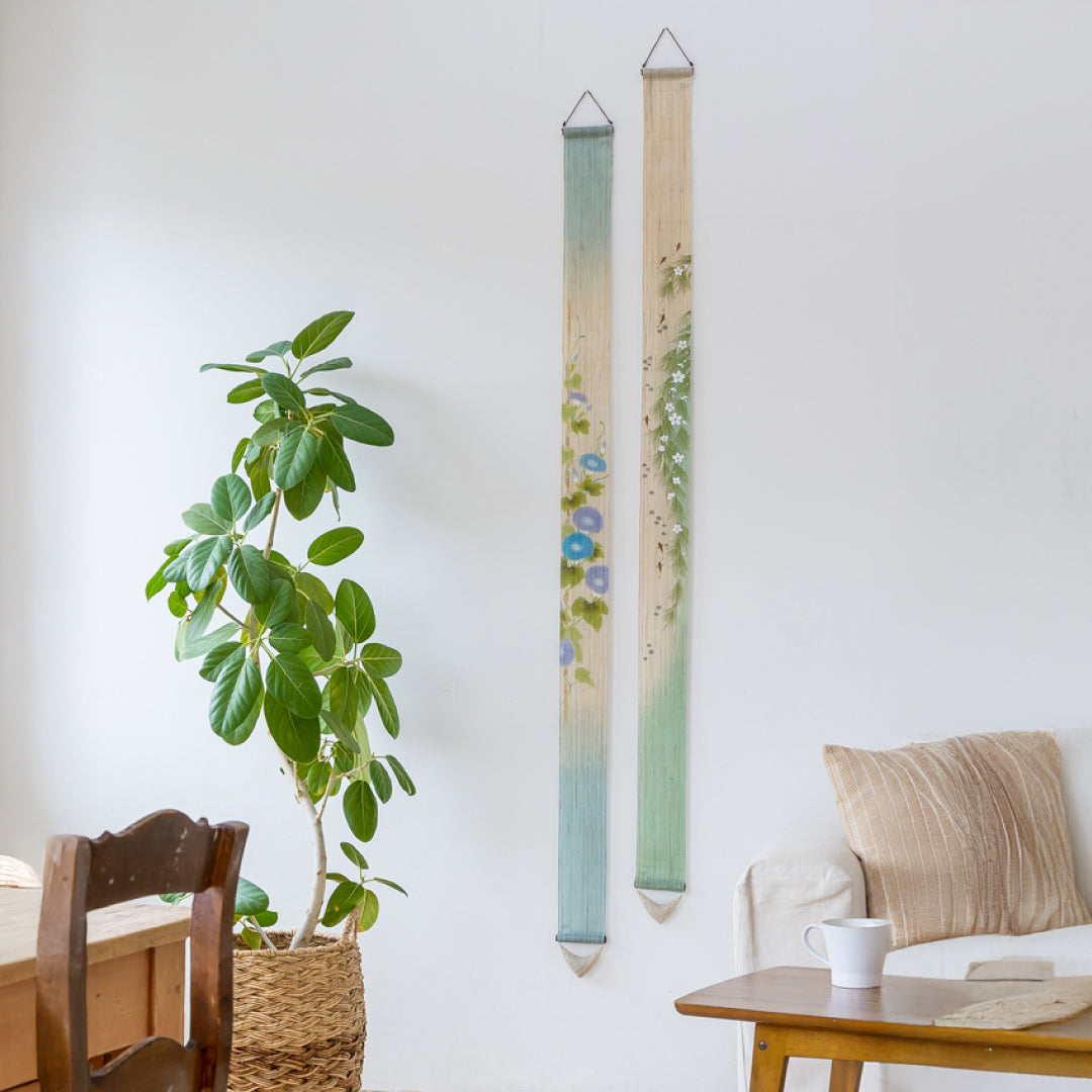 - ► 清らかな水の中でしか育たない梅花藻を描いた、和のモダンインテリアを演出する手染め麻タペストリー。