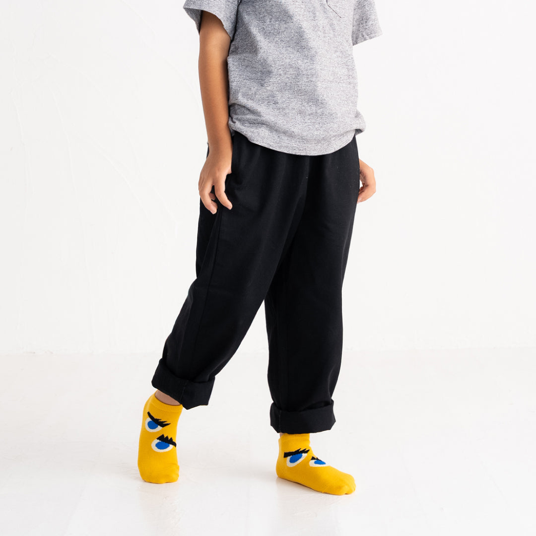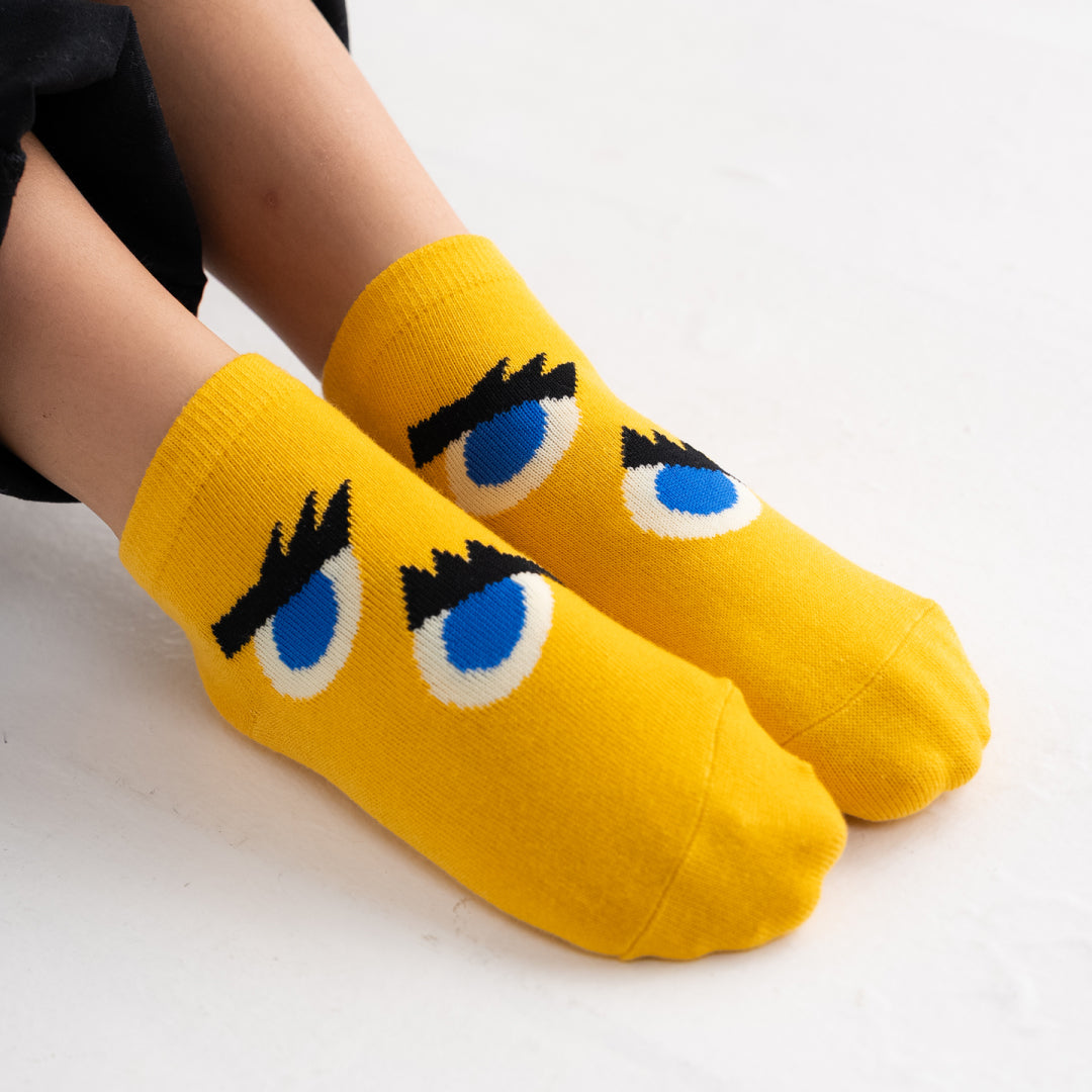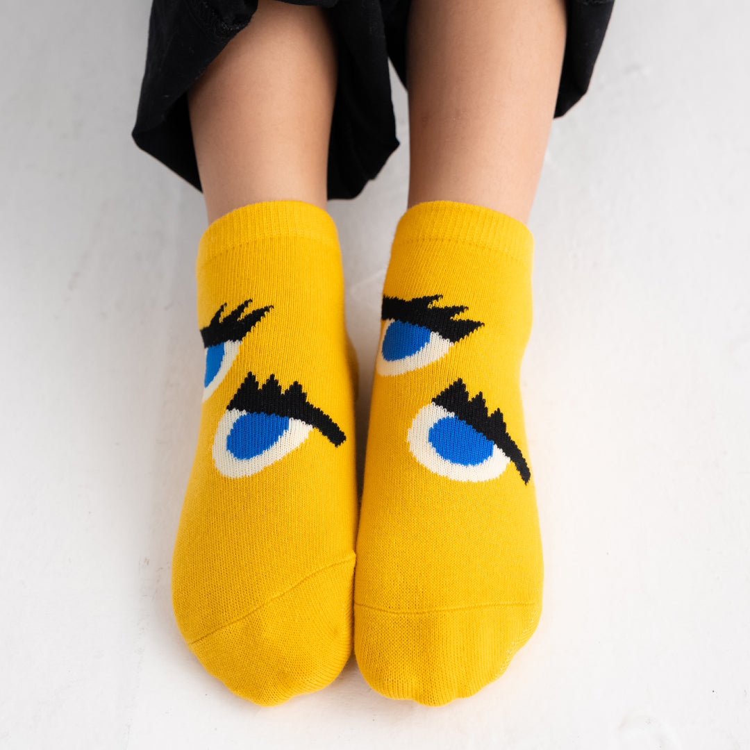 - ► 「じーっ」とこちらを見つめる目が、足元からさりげない遊び心をアピール。シンプルなのに一度見たら忘れられないデザインが、コーディネートに絶妙なスパイスを加えます。