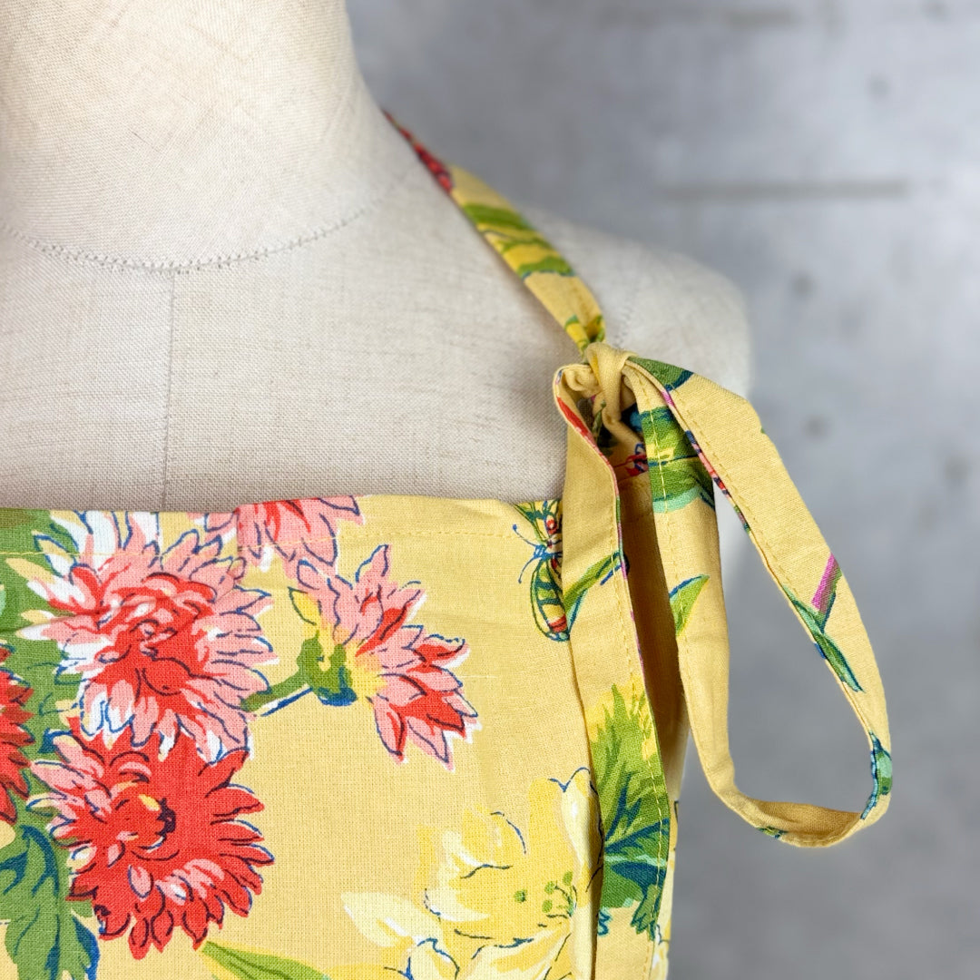- ► 吸水性に優れたインド綿100%を使用し、首掛けタイプで肩紐が落ちにくいストレスフリーな設計。 ループ付きの紐でお好みのサイズに調整でき、前結びのリボンがアクティブな動きをサポートします。